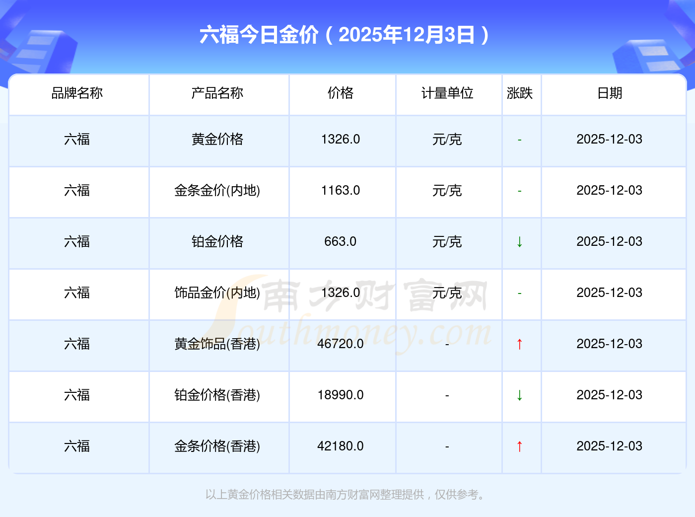 2025年12月3日亳州六福最新價(jià)格:黃金價(jià)格1328.0元/克,鉑金價(jià)格663.0元/克,飾品金價(jià)(內(nèi)地)1328.0元/克,黃金飾品(香港)46770.0,鉑金價(jià)格(香港)18990.0,金條價(jià)格(香港)42190.0,金條金價(jià)(內(nèi)地)1165.0元/克,黃金價(jià)格1327.0元/克,鉑金價(jià)格600.0元/克,足金價(jià)格1327.0元/克,黃金價(jià)格1326.0元/克。