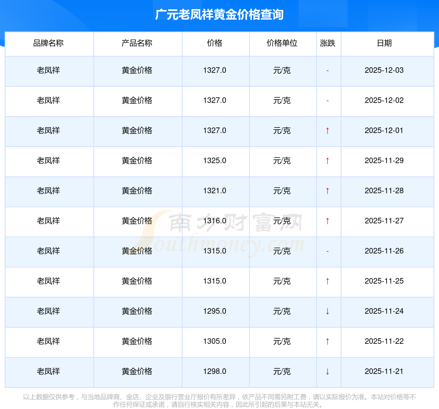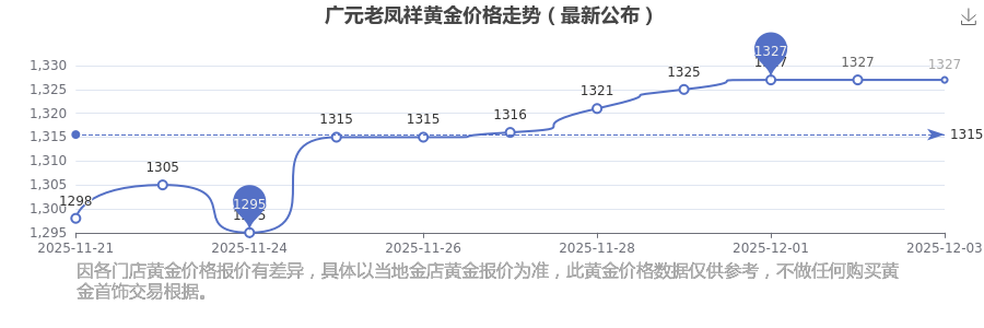 今日廣元老鳳祥黃金價格為1327.0元/克。