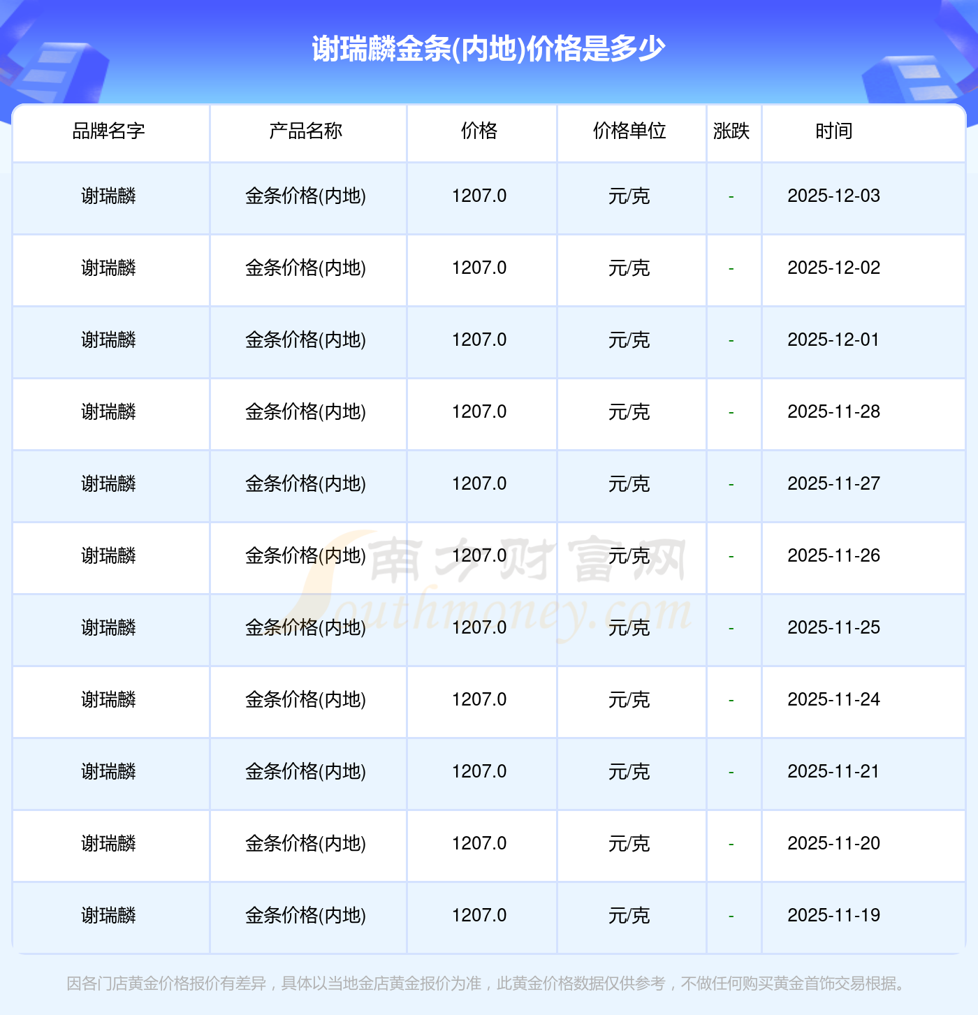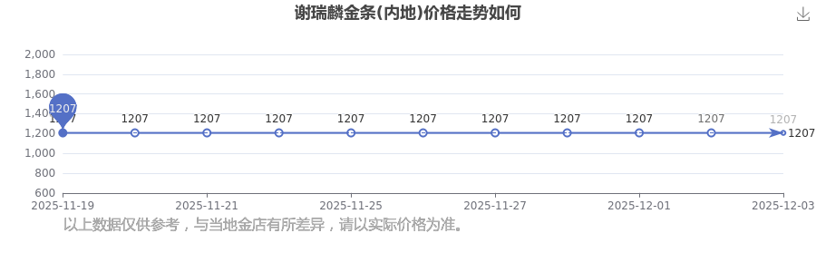 據(jù)了解,今日謝瑞麟 金條價(jià)格(內(nèi)地)的最新價(jià)格為1207.0元/克。