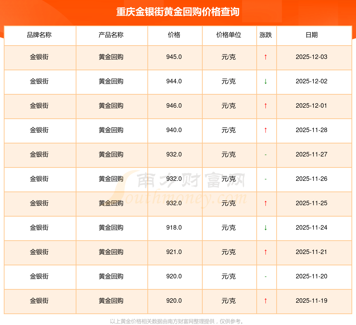 (2025年12月3日)今日重慶金銀街黃金回購價(jià)格是945.0元/克。