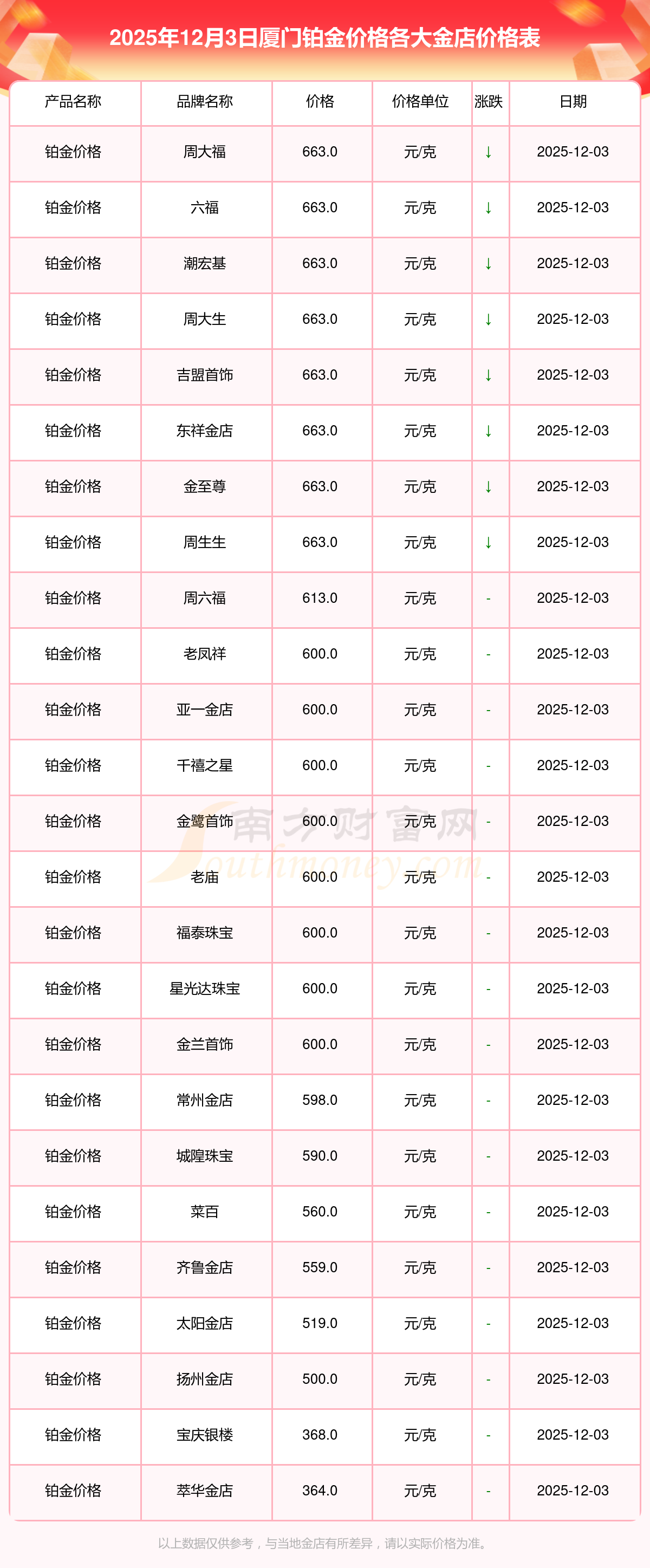 2025年12月3日廈門(mén)周大福、周大福、周大福、周大福、周大福、周大福、周大福、老鳳祥、老鳳祥、老鳳祥、六福等各大金店品牌鉑金價(jià)格最新價(jià)格行情來(lái)了,如下:周大福黃金價(jià)格1328.0元/克,周大福鉑金價(jià)格663.0元/克,周大福飾品金價(jià)(內(nèi)地)1328.0元/克,周大福黃金飾品(香港)46770.0,周大福鉑金價(jià)格(香港)18990.0,周大福金條價(jià)格(香港)42190.0,周大福金條金價(jià)(內(nèi)地)1165.0元/克,老鳳祥黃金價(jià)格1327.0元/克,老鳳祥鉑金價(jià)格600.0元/克,老鳳祥足金價(jià)格1327.0元/克,六福黃金價(jià)格1326.0元/克。