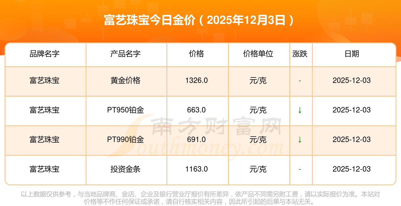今天是2025年12月3日,周大福、周大福、周大福、周大福、周大福、周大福、周大福、老鳳祥、老鳳祥、老鳳祥、六福等各大金店品牌黃金價(jià)格最新價(jià)格如下:周大福1328.0元/克、周大福663.0元/克、周大福1328.0元/克、周大福46770.0、周大福18990.0、周大福42190.0、周大福1165.0元/克、老鳳祥1327.0元/克、老鳳祥600.0元/克、老鳳祥1327.0元/克、六福1326.0元/克。