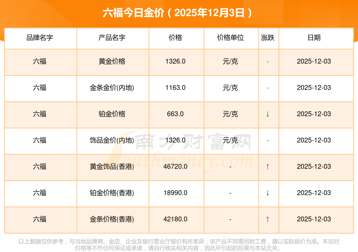 2025年12月3日,周大福、周大福、周大福、周大福、周大福、周大福、周大福、老鳳祥、老鳳祥、老鳳祥、六福等各大金店品牌黃金價(jià)格今日價(jià)格如下:周大福1328.0元/克、周大福663.0元/克、周大福1328.0元/克、周大福46770.0、周大福18990.0、周大福42190.0、周大福1165.0元/克、老鳳祥1327.0元/克、老鳳祥600.0元/克、老鳳祥1327.0元/克、六福1326.0元/克。