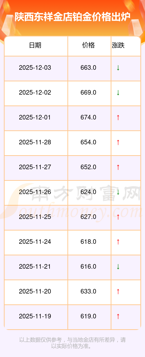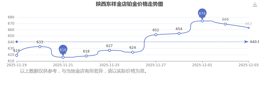 于 2025年12月3日,陜西東祥金店鉑金價格的克價為663.0元/克。