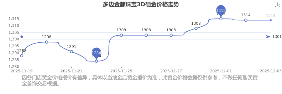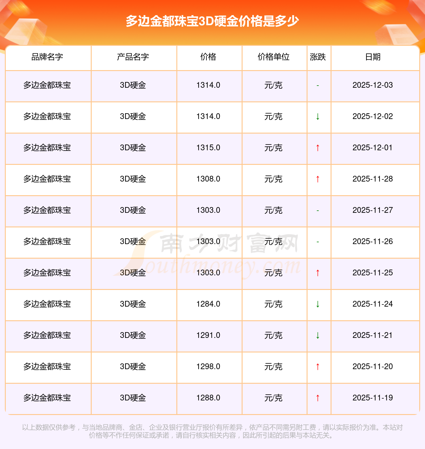今日多邊金都珠寶3D硬金價(jià)格:1314.0元/克。