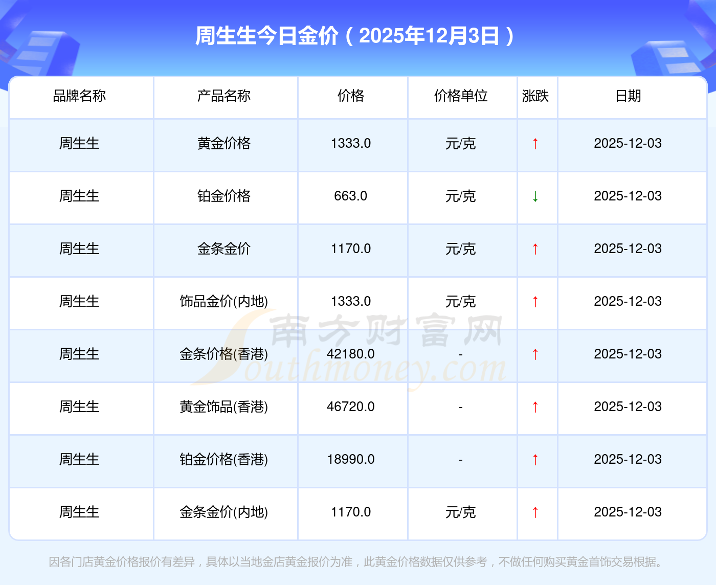 2025年12月3日周生生金價查詢:黃金價格1328.0元/克,鉑金價格663.0元/克,飾品金價(內(nèi)地)1328.0元/克,黃金飾品(香港)46770.0,鉑金價格(香港)18990.0,金條價格(香港)42190.0,金條金價(內(nèi)地)1165.0元/克,黃金價格1327.0元/克,鉑金價格600.0元/克,足金價格1327.0元/克,黃金價格1326.0元/克。