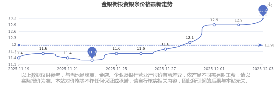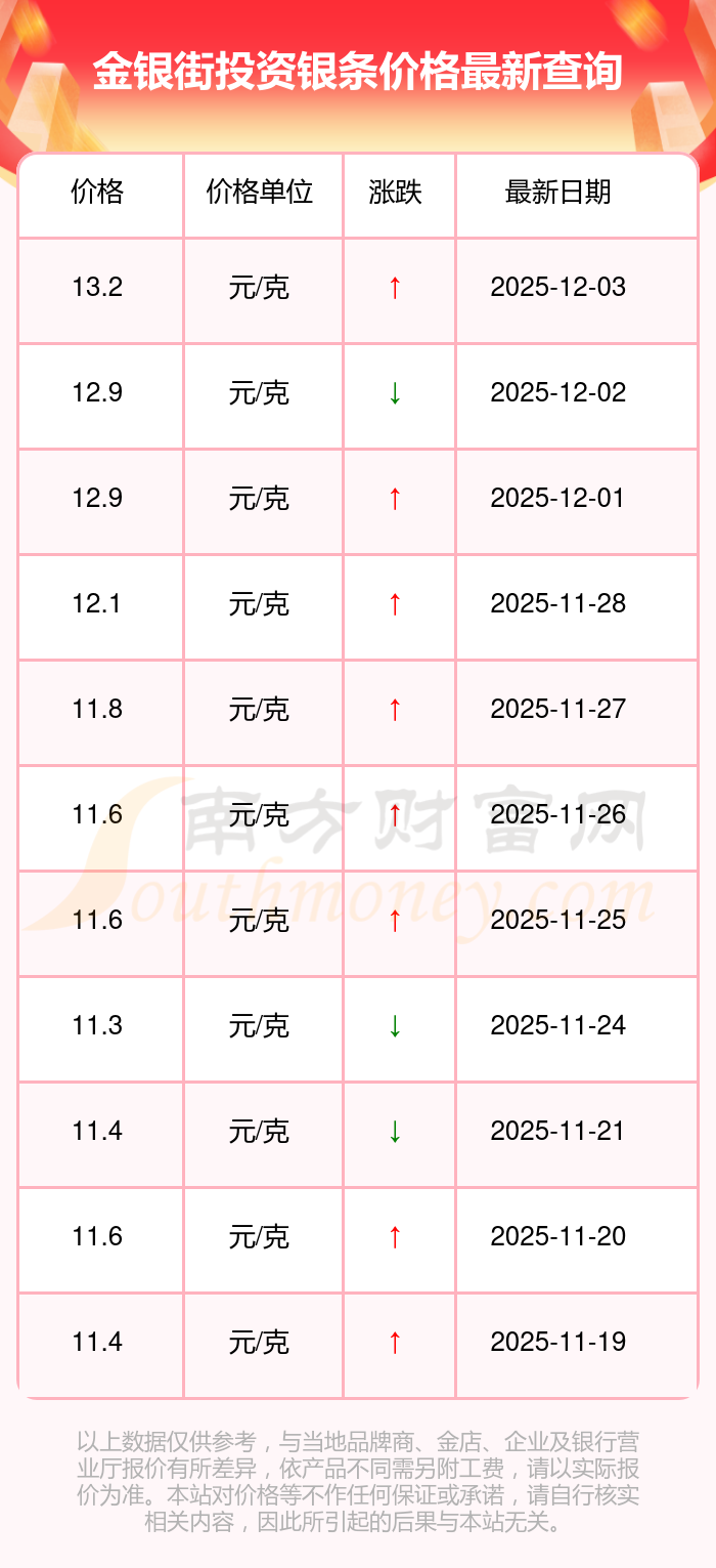 今日(2025年12月3日),金銀街投資銀條價(jià)格:13.2元/克。