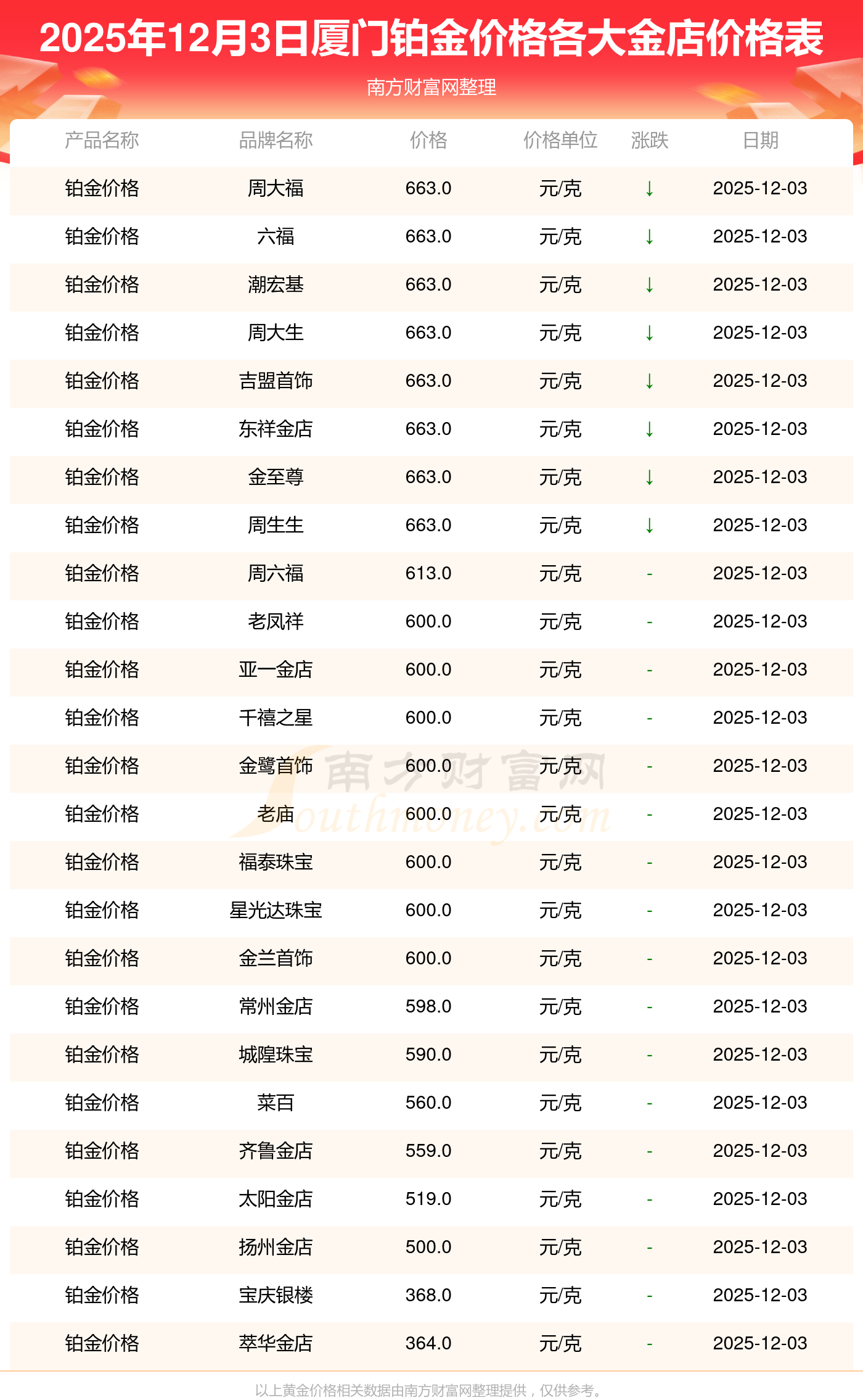 廈門各金店鉑金價(jià)格首飾價(jià)格多少錢一克(2025年12月3日鉑金價(jià)格最新一覽)