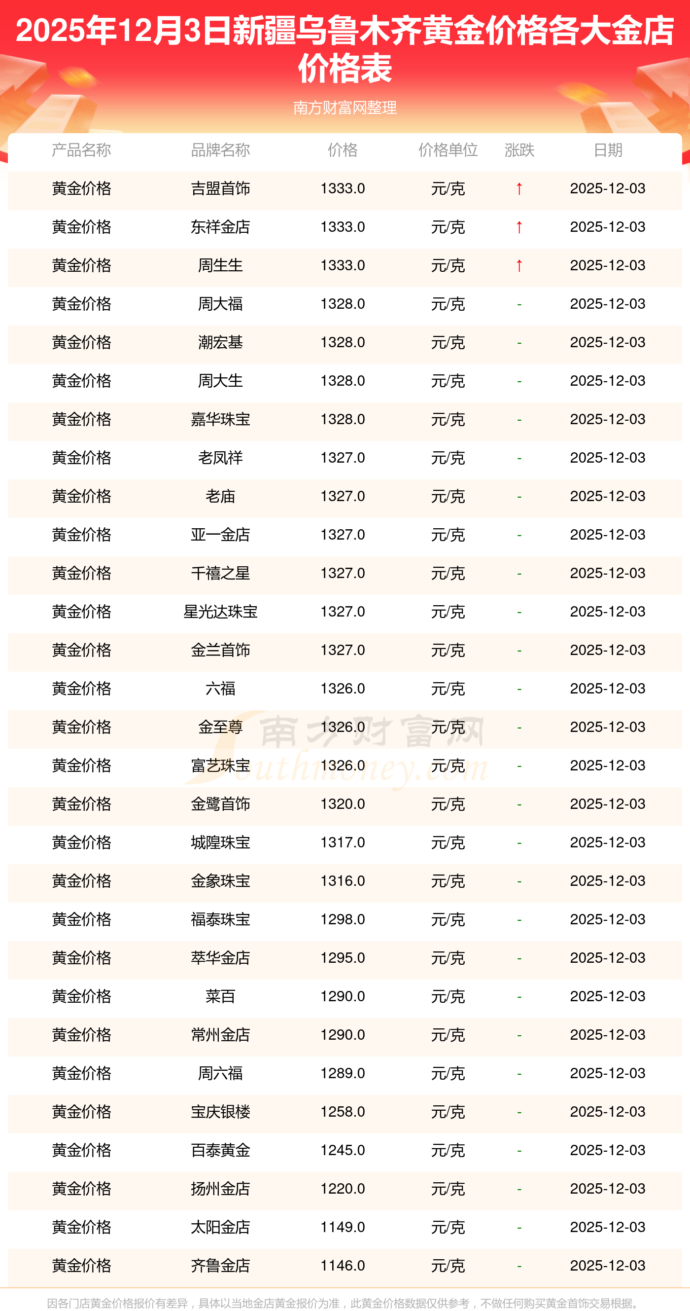2025年12月3日新疆烏魯木齊各大金店黃金價格最新價格查詢來了:周大福1328.0元/克,周大福663.0元/克,周大福1328.0元/克,周大福46770.0,周大福18990.0,周大福42190.0,周大福1165.0元/克,老鳳祥1327.0元/克,老鳳祥600.0元/克,老鳳祥1327.0元/克,六福1326.0元/克。