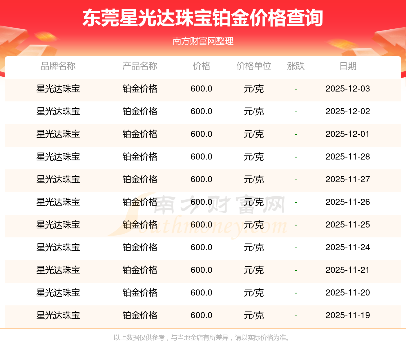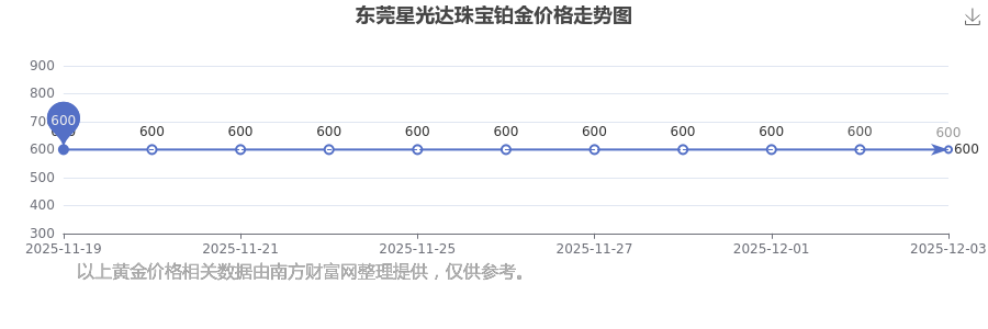 (2025年12月3日)東莞星光達(dá)珠寶鉑金價格現(xiàn)在為600.0元/克。