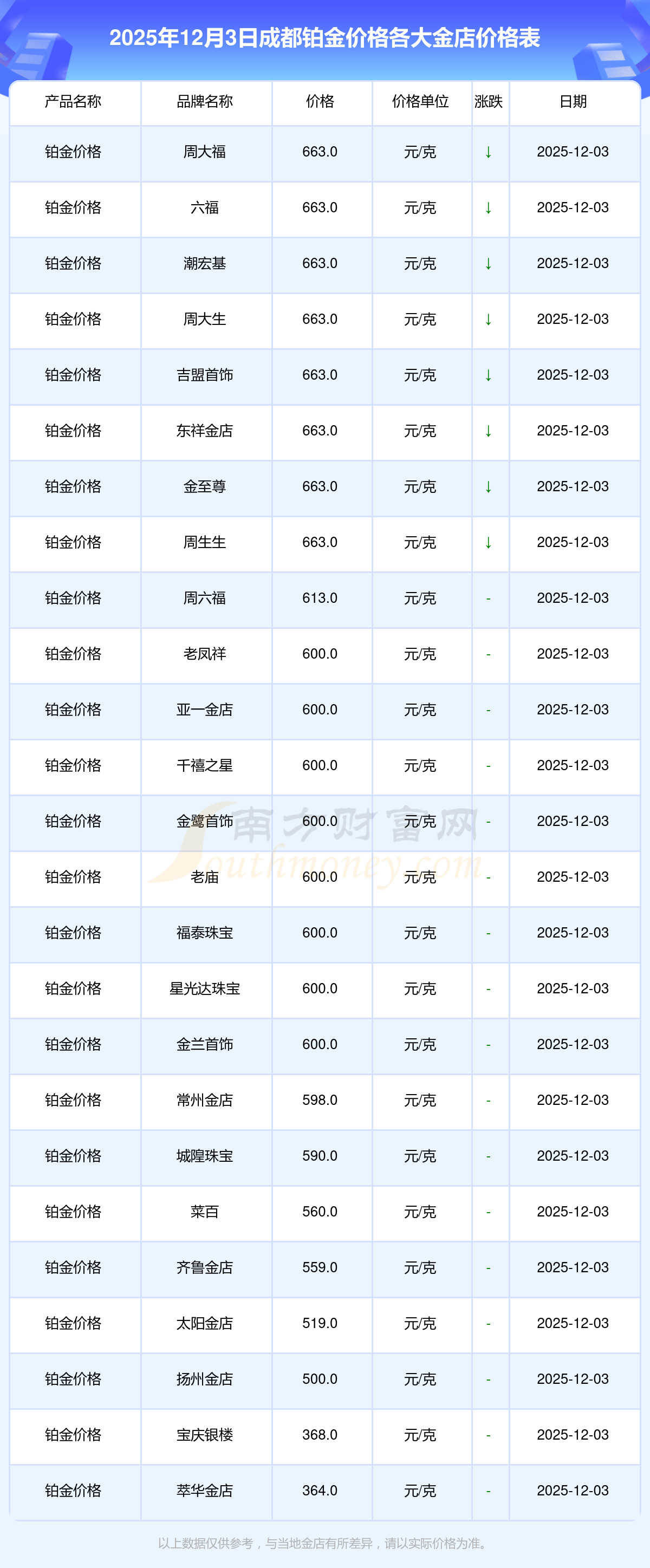 2025年12月3日,成都周大福、周大福、周大福、周大福、周大福、周大福、周大福、老鳳祥、老鳳祥、老鳳祥、六福等各大金店品牌鉑金價格今日價格如下:周大福1328.0元/克、周大福663.0元/克、周大福1328.0元/克、周大福46770.0、周大福18990.0、周大福42190.0、周大福1165.0元/克、老鳳祥1327.0元/克、老鳳祥600.0元/克、老鳳祥1327.0元/克、六福1326.0元/克。