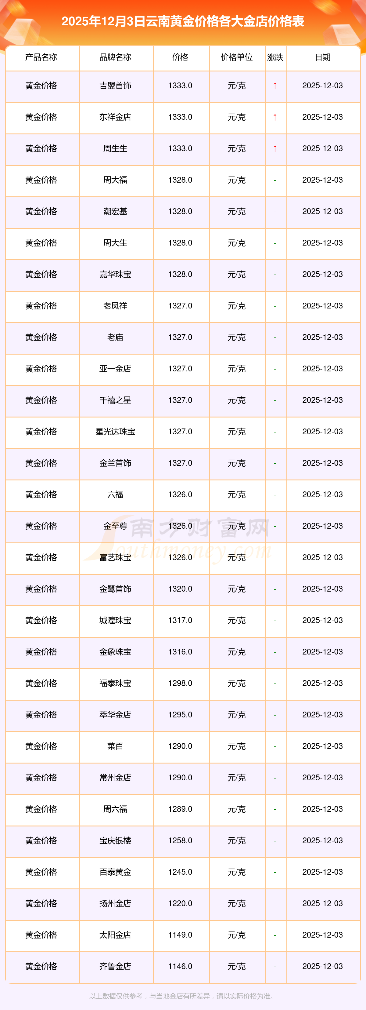 今天是2025年12月3日,云南周大福、周大福、周大福、周大福、周大福、周大福、周大福、老鳳祥、老鳳祥、老鳳祥、六福等各大金店品牌黃金價(jià)格最新價(jià)格如下:周大福1328.0元/克、周大福663.0元/克、周大福1328.0元/克、周大福46770.0、周大福18990.0、周大福42190.0、周大福1165.0元/克、老鳳祥1327.0元/克、老鳳祥600.0元/克、老鳳祥1327.0元/克、六福1326.0元/克。
