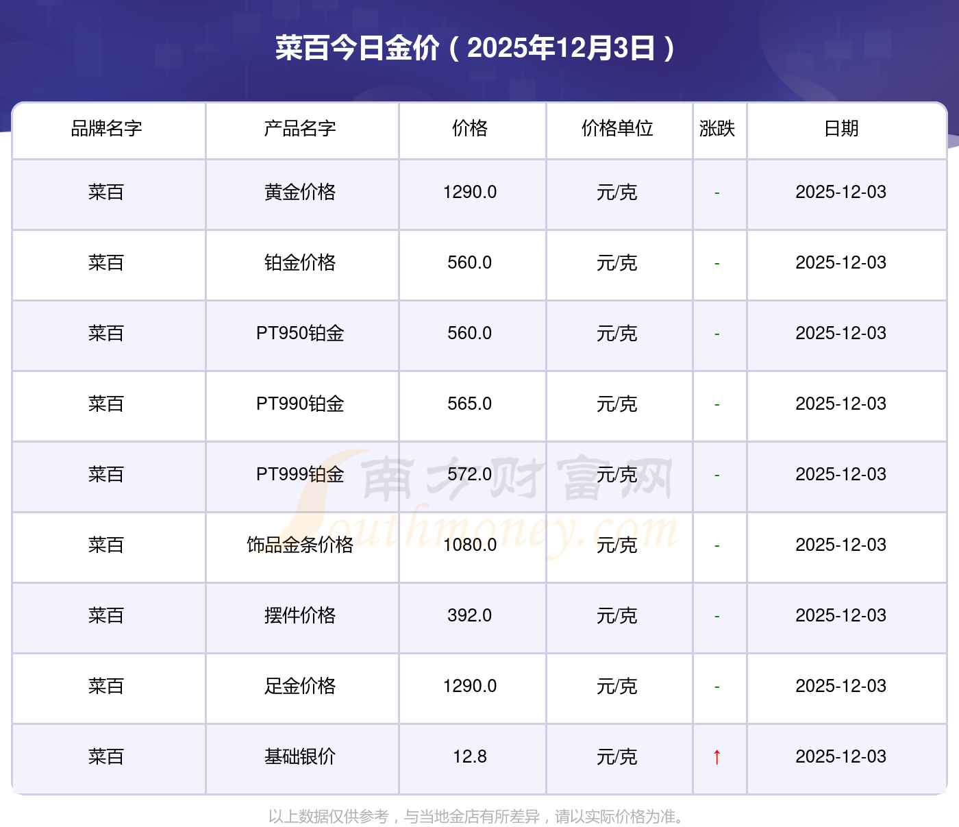 2025年12月3日,周大福、周大福、周大福、周大福、周大福、周大福、周大福、老鳳祥、老鳳祥、老鳳祥、六福等各大金店品牌黃金價(jià)格今日價(jià)格如下:周大福1328.0元/克、周大福663.0元/克、周大福1328.0元/克、周大福46770.0、周大福18990.0、周大福42190.0、周大福1165.0元/克、老鳳祥1327.0元/克、老鳳祥600.0元/克、老鳳祥1327.0元/克、六福1326.0元/克。