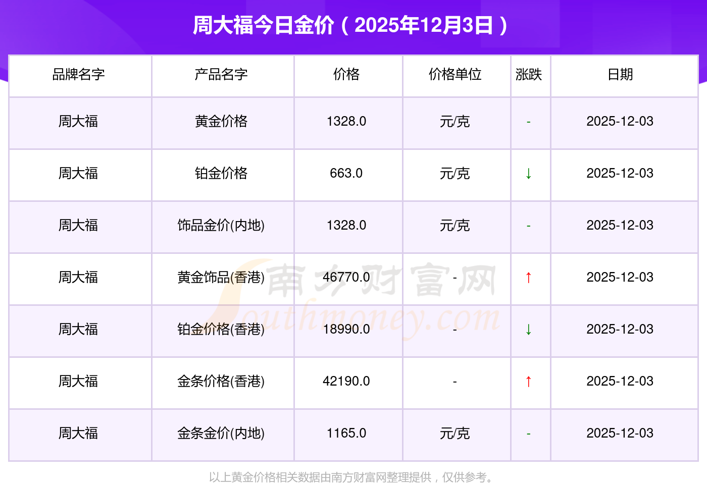 2025年12月3日周大福金價查詢:黃金價格1328.0元/克,鉑金價格663.0元/克,飾品金價(內(nèi)地)1328.0元/克,黃金飾品(香港)46770.0,鉑金價格(香港)18990.0,金條價格(香港)42190.0,金條金價(內(nèi)地)1165.0元/克,黃金價格1327.0元/克,鉑金價格600.0元/克,足金價格1327.0元/克,黃金價格1326.0元/克。