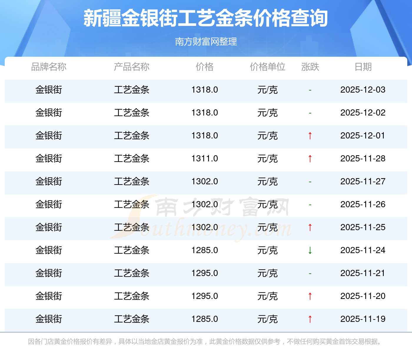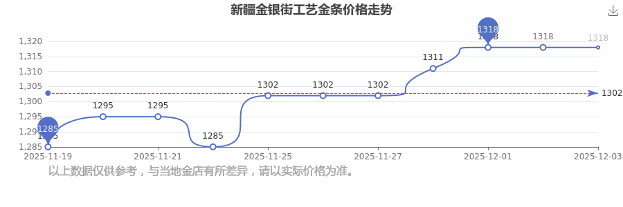 新疆金銀街工藝金條在 2025年12月3日,其市場價格為 1318.0元/克。