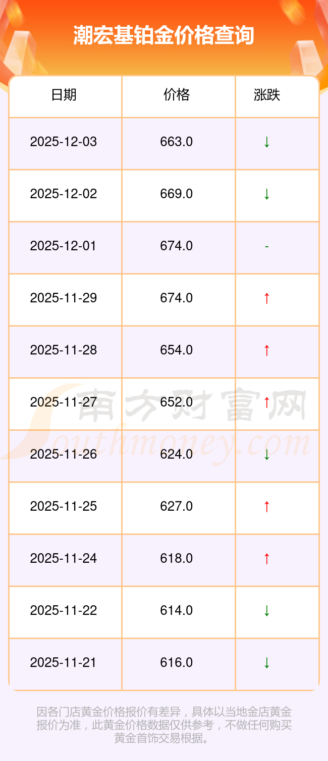 今日(2025年12月3日)潮宏基鉑金價(jià)格為663.0元/克。
