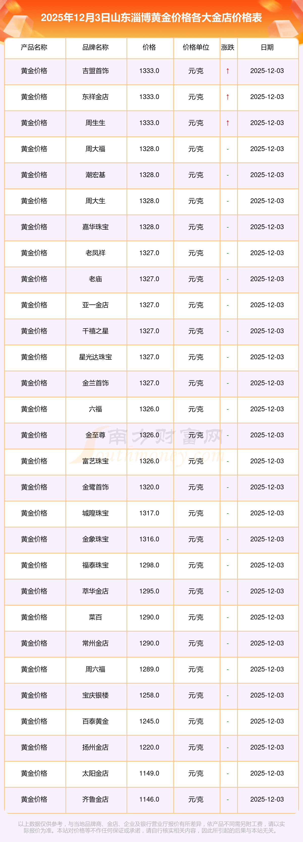 2025年12月3日山東淄博周大福、周大福、周大福、周大福、周大福、周大福、周大福、老鳳祥、老鳳祥、老鳳祥、六福等各大金店品牌黃金價(jià)格最新價(jià)格如下:周大福黃金價(jià)格1328.0元/克,周大福鉑金價(jià)格663.0元/克,周大福飾品金價(jià)(內(nèi)地)1328.0元/克,周大福黃金飾品(香港)46770.0,周大福鉑金價(jià)格(香港)18990.0,周大福金條價(jià)格(香港)42190.0,周大福金條金價(jià)(內(nèi)地)1165.0元/克,老鳳祥黃金價(jià)格1327.0元/克,老鳳祥鉑金價(jià)格600.0元/克,老鳳祥足金價(jià)格1327.0元/克,六福黃金價(jià)格1326.0元/克。