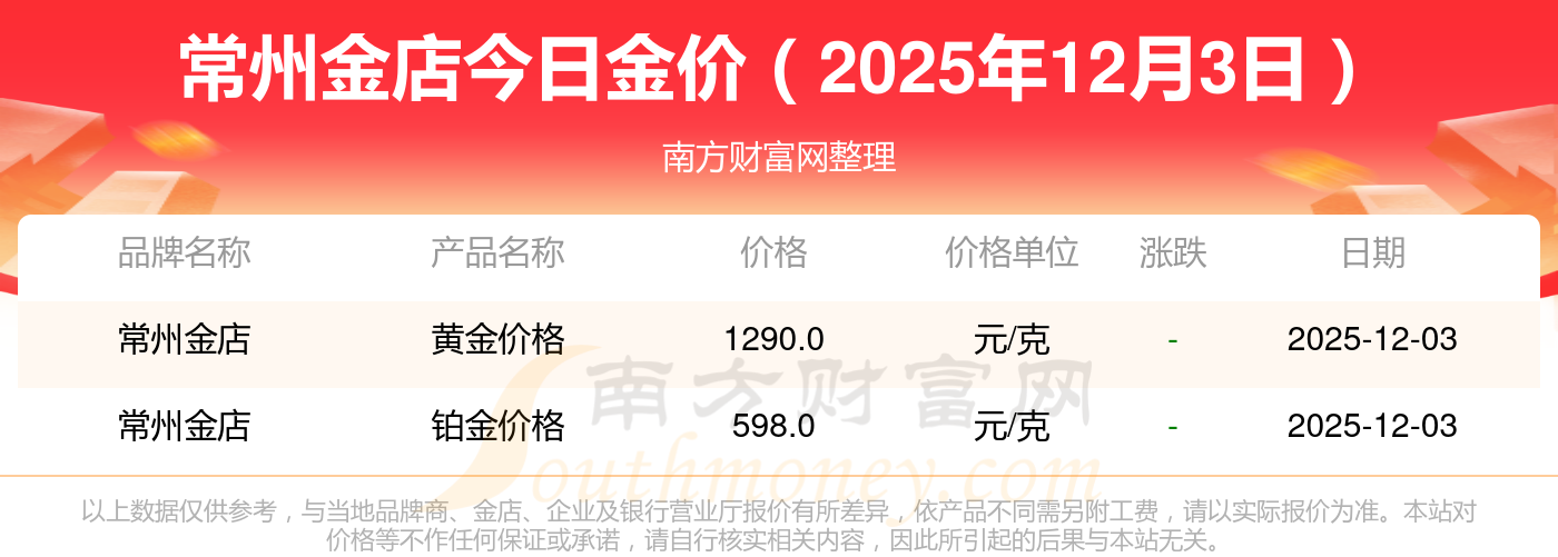2025年12月3日各大金店黃金價(jià)格最新價(jià)格:周大福1328.0元/克,周大福663.0元/克,周大福1328.0元/克,周大福46770.0,周大福18990.0,周大福42190.0,周大福1165.0元/克,老鳳祥1327.0元/克,老鳳祥600.0元/克,老鳳祥1327.0元/克,六福1326.0元/克。