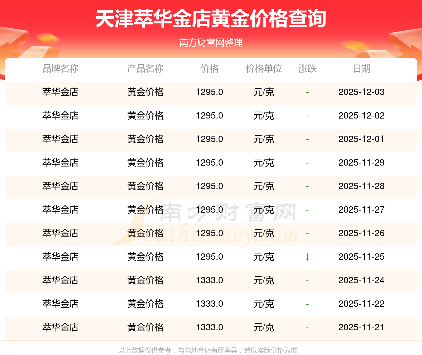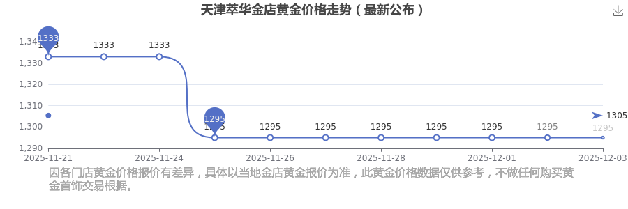 今日(2025年12月3日)天津萃華金店黃金價(jià)格為1295.0元/克。