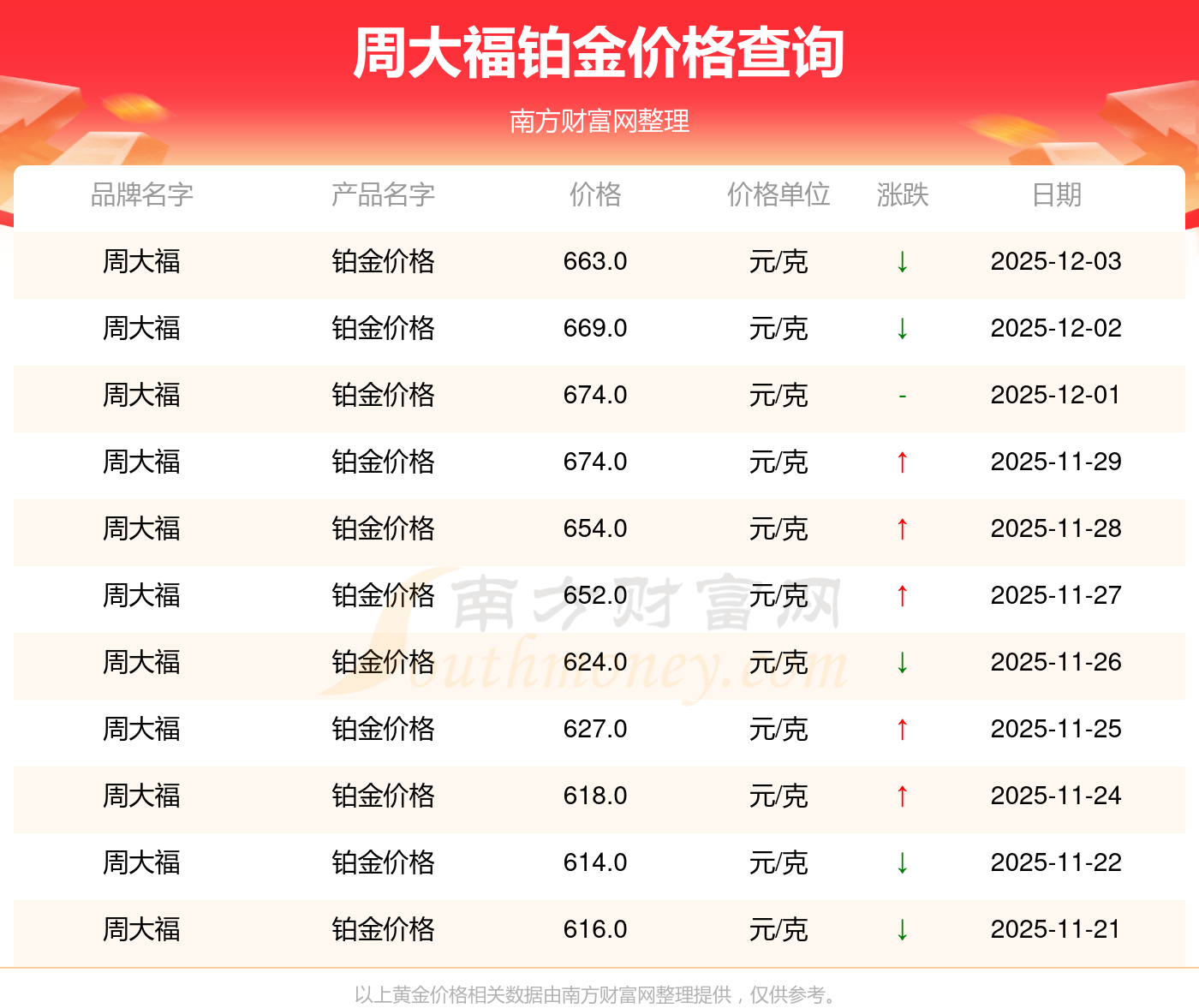 2025年12月3日周大福鉑金價格最新是663.0元/克。