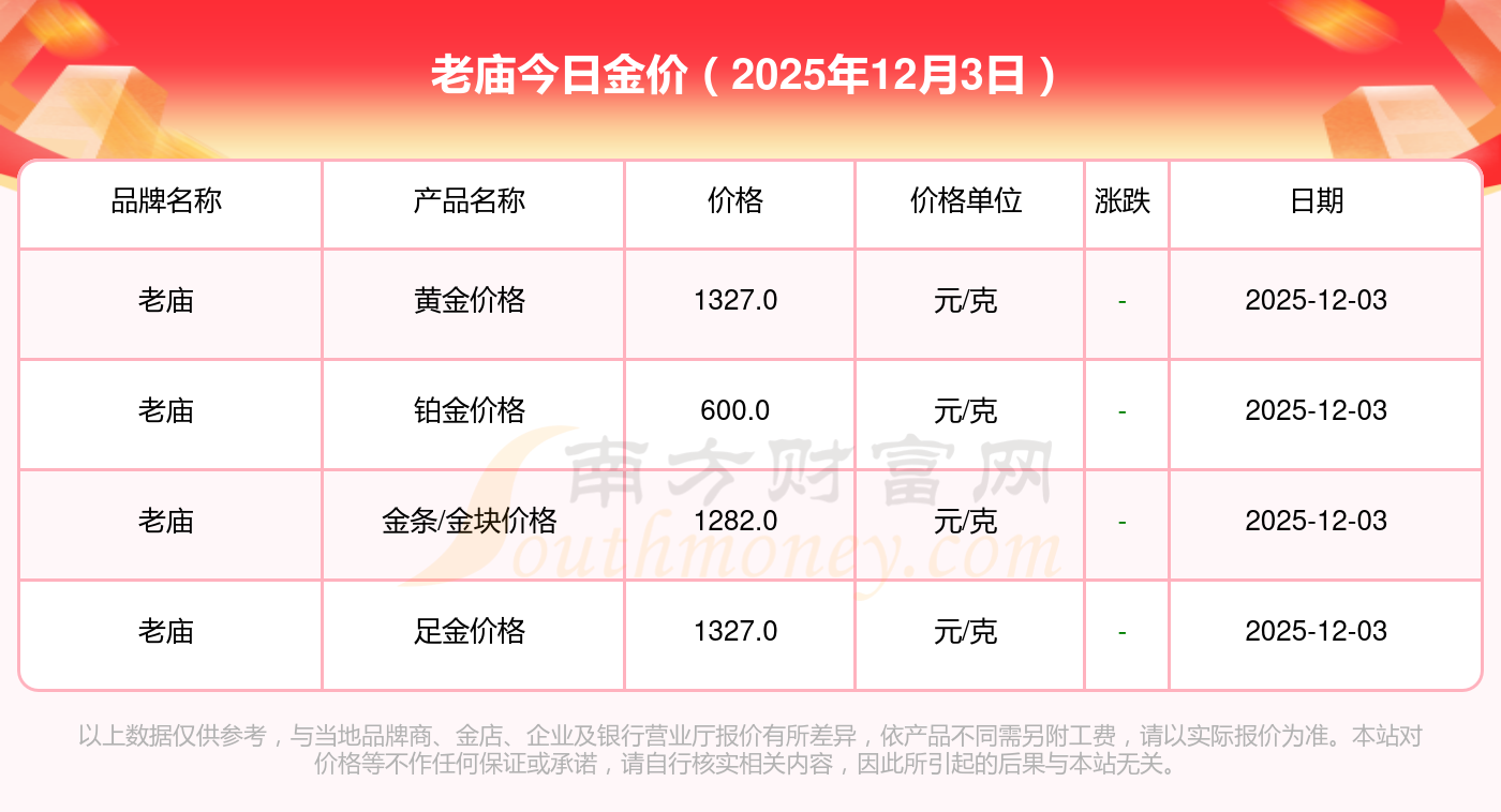 今天是2025年12月3日,周大福、周大福、周大福、周大福、周大福、周大福、周大福、老鳳祥、老鳳祥、老鳳祥、六福等各大金店品牌足金價格最新價格如下:周大福1328.0元/克、周大福663.0元/克、周大福1328.0元/克、周大福46770.0、周大福18990.0、周大福42190.0、周大福1165.0元/克、老鳳祥1327.0元/克、老鳳祥600.0元/克、老鳳祥1327.0元/克、六福1326.0元/克。