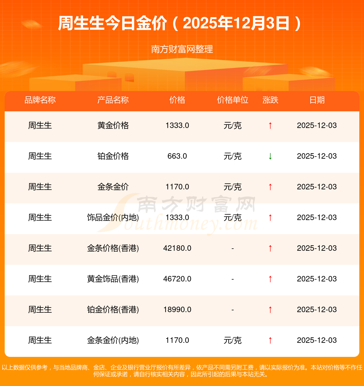 2025年12月3日各大金店黃金價格最新價格:周大福1328.0元/克,周大福663.0元/克,周大福1328.0元/克,周大福46770.0,周大福18990.0,周大福42190.0,周大福1165.0元/克,老鳳祥1327.0元/克,老鳳祥600.0元/克,老鳳祥1327.0元/克,六福1326.0元/克。