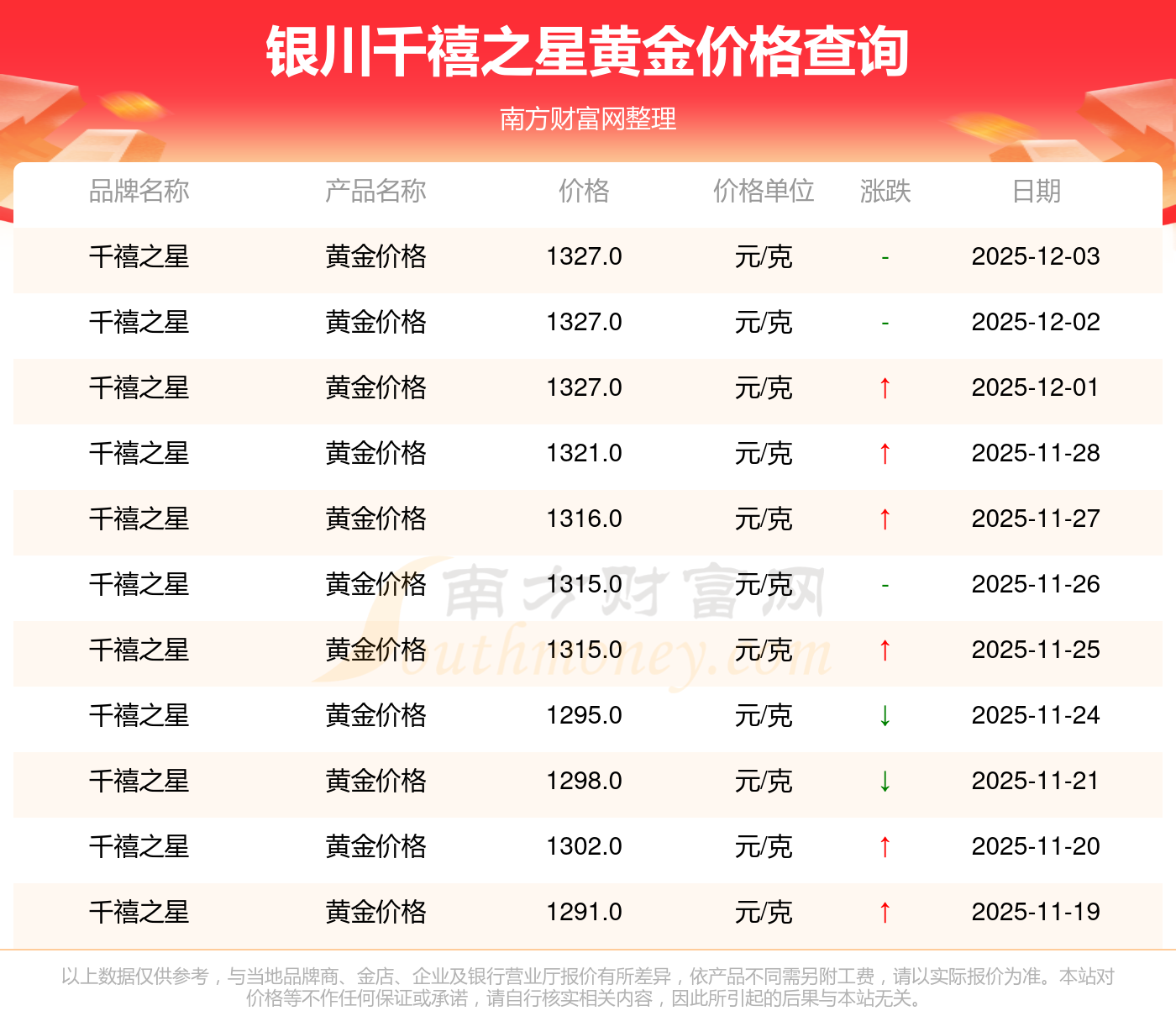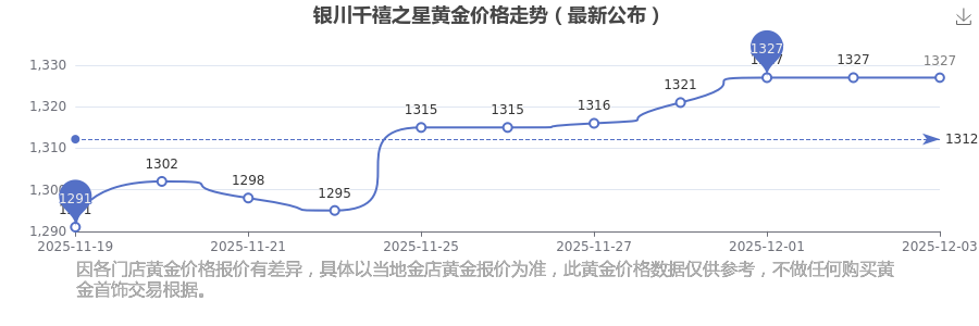 今日(2025年12月3日),銀川千禧之星黃金價格的價格是1327.0元/克。