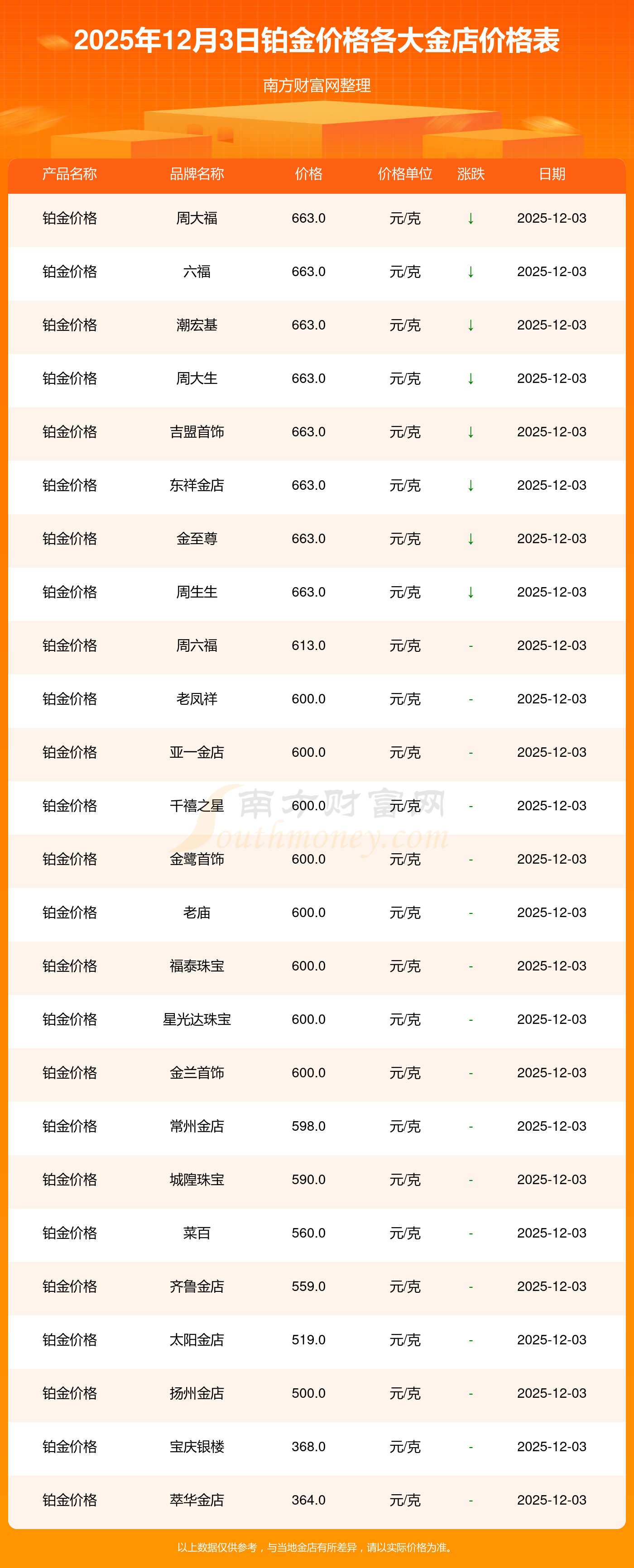 2025年12月3日周大福、周大福、周大福、周大福、周大福、周大福、周大福、老鳳祥、老鳳祥、老鳳祥、六福等各大金店品牌鉑金價格最新價格如下:周大福黃金價格1328.0元/克,周大福鉑金價格663.0元/克,周大福飾品金價(內(nèi)地)1328.0元/克,周大福黃金飾品(香港)46770.0,周大福鉑金價格(香港)18990.0,周大福金條價格(香港)42190.0,周大福金條金價(內(nèi)地)1165.0元/克,老鳳祥黃金價格1327.0元/克,老鳳祥鉑金價格600.0元/克,老鳳祥足金價格1327.0元/克,六福黃金價格1326.0元/克。