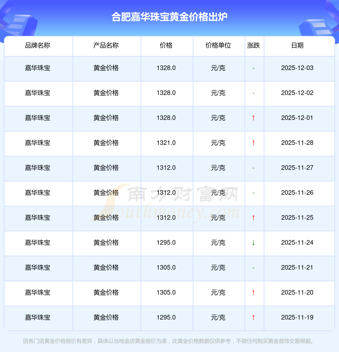 合肥嘉華珠寶現(xiàn)在黃金價(jià)格每克多少?想了解今天黃金一克的行情價(jià)是多少錢?今日合肥嘉華珠寶黃金價(jià)格查詢,2025年12月3日合肥嘉華珠寶黃金價(jià)格:1328.0元/克。