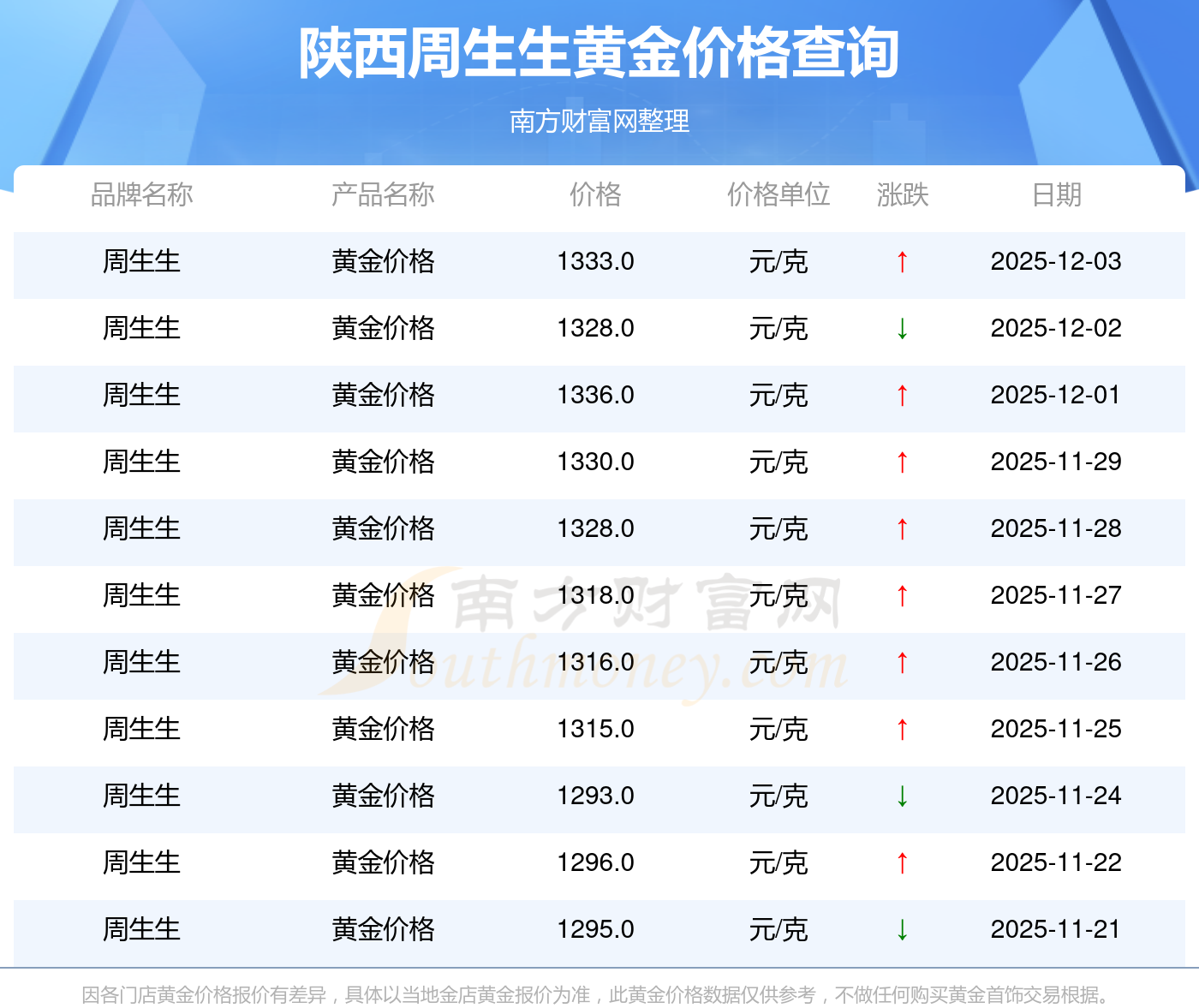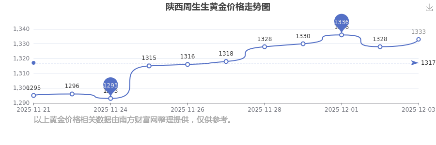 今日陜西周生生黃金價(jià)格:1333.0元/克。