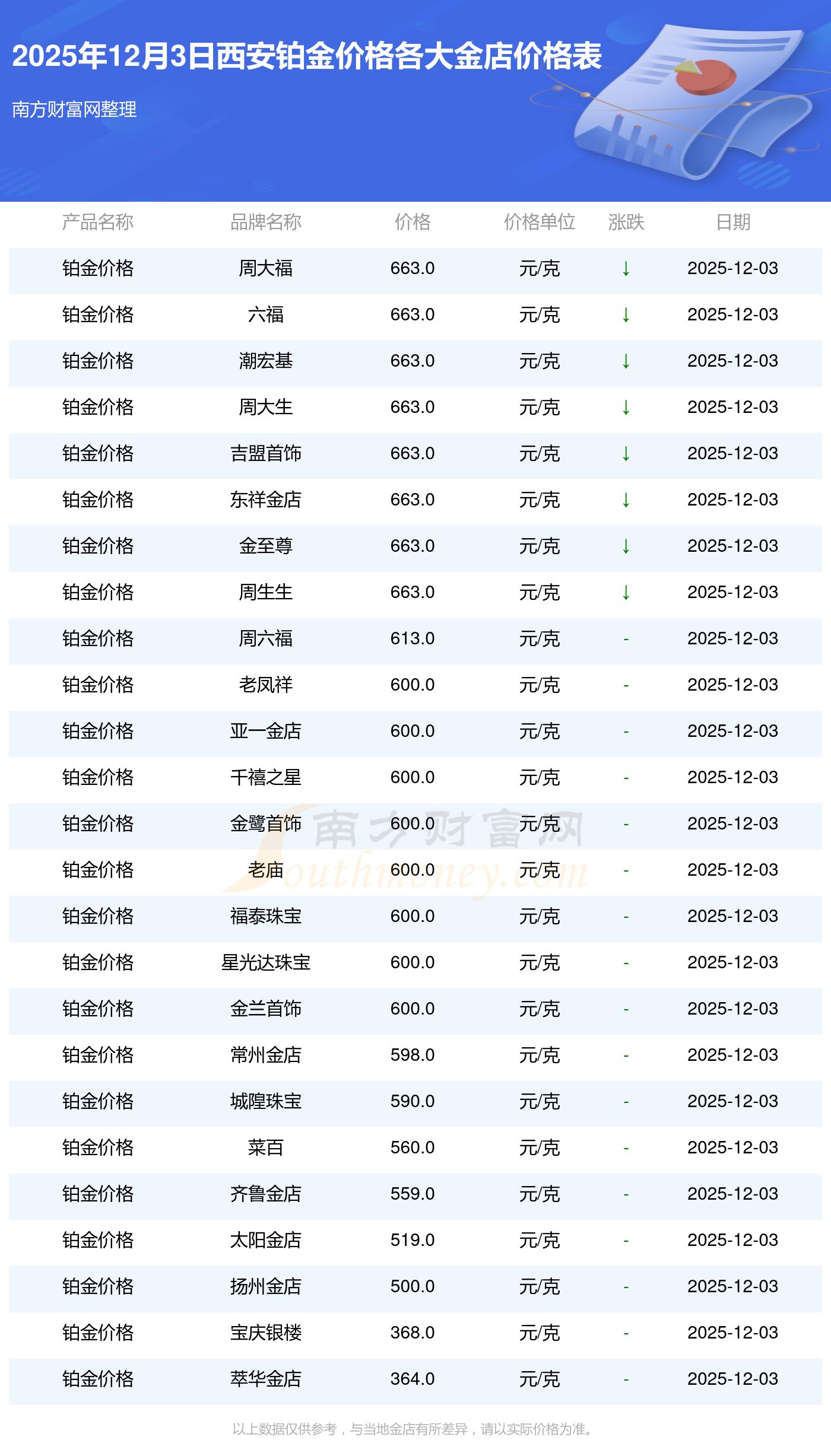 2025年12月3日西安各大金店鉑金價(jià)格最新價(jià)格查詢來(lái)了:周大福1328.0元/克,周大福663.0元/克,周大福1328.0元/克,周大福46770.0,周大福18990.0,周大福42190.0,周大福1165.0元/克,老鳳祥1327.0元/克,老鳳祥600.0元/克,老鳳祥1327.0元/克,六福1326.0元/克。