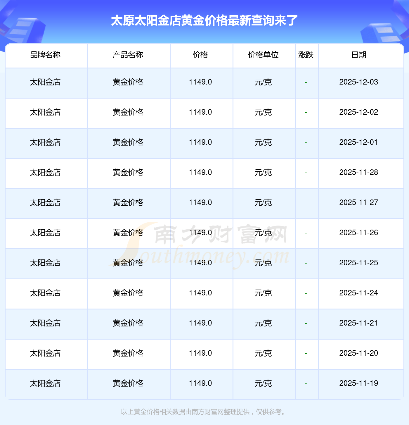 今日(2025年12月3日)太原太陽金店黃金價格:1149.0元/克。