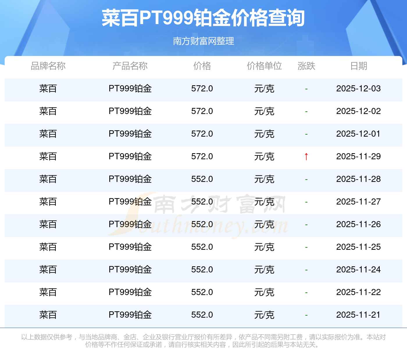 今日菜百PT999鉑金價格最新為572.0元/克。