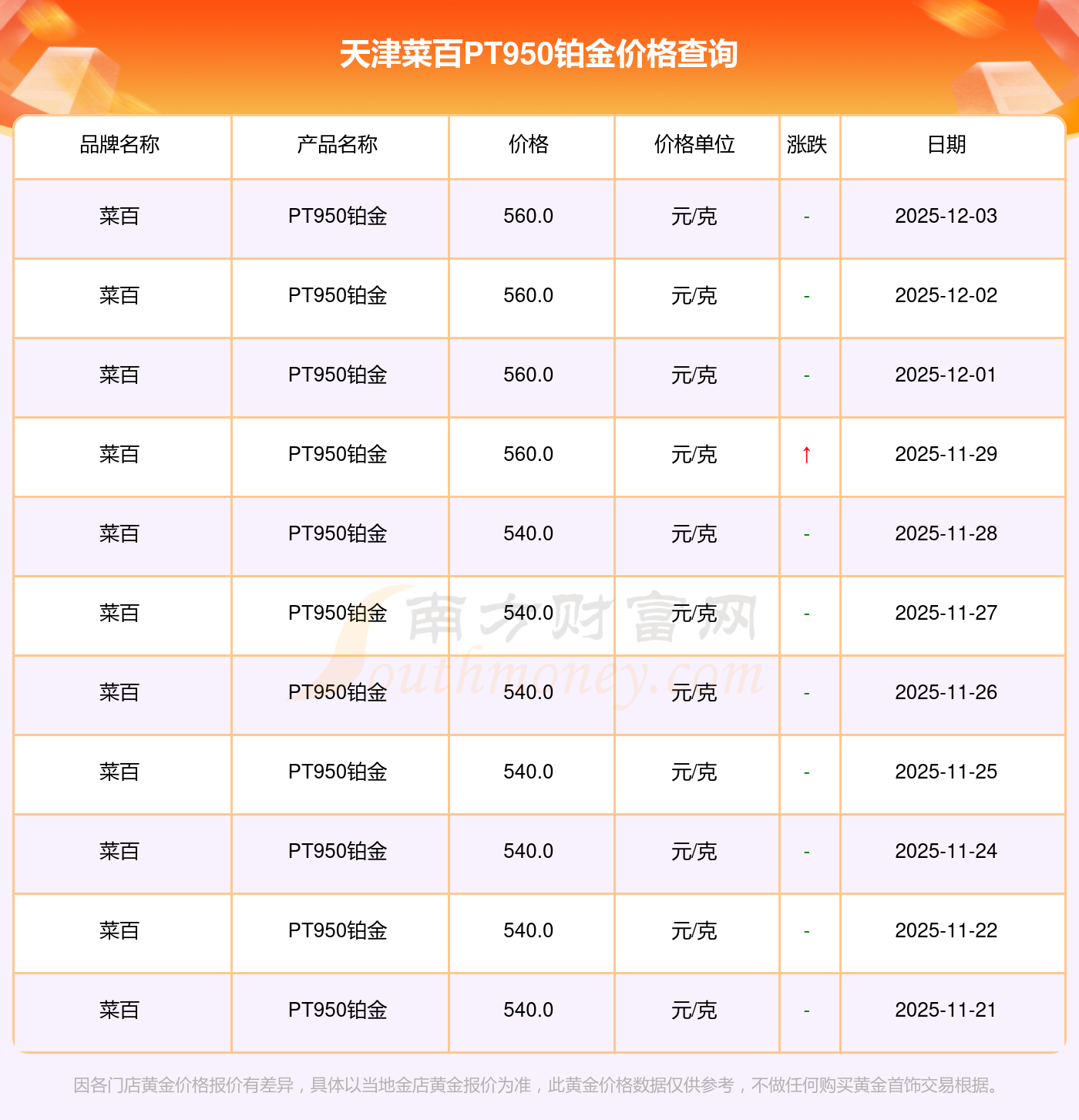 2025年12月3日周大福、周大福、周大福、周大福、周大福、周大福、周大福、老鳳祥、老鳳祥、老鳳祥、六福等各大金店品牌PT950鉑金最新價(jià)格如下:周大福黃金價(jià)格1328.0元/克,周大福鉑金價(jià)格663.0元/克,周大福飾品金價(jià)(內(nèi)地)1328.0元/克,周大福黃金飾品(香港)46770.0,周大福鉑金價(jià)格(香港)18990.0,周大福金條價(jià)格(香港)42190.0,周大福金條金價(jià)(內(nèi)地)1165.0元/克,老鳳祥黃金價(jià)格1327.0元/克,老鳳祥鉑金價(jià)格600.0元/克,老鳳祥足金價(jià)格1327.0元/克,六福黃金價(jià)格1326.0元/克。