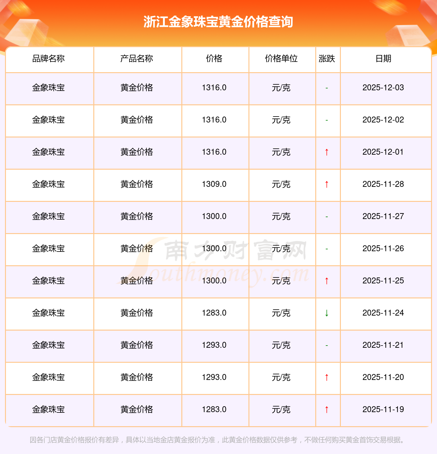 今日一克黃金在市場(chǎng)上的價(jià)格是多少?浙江金象珠寶黃金價(jià)格現(xiàn)在每克多少錢(qián)?今日浙江金象珠寶黃金價(jià)格查詢,今日(2025年12月3日),浙江金象珠寶黃金價(jià)格的定價(jià)為 1316.0元/克。