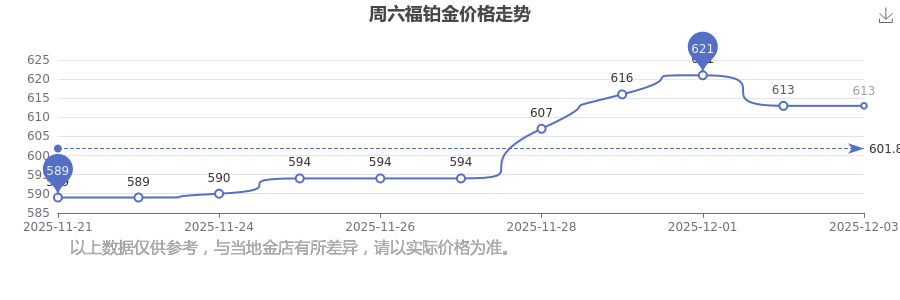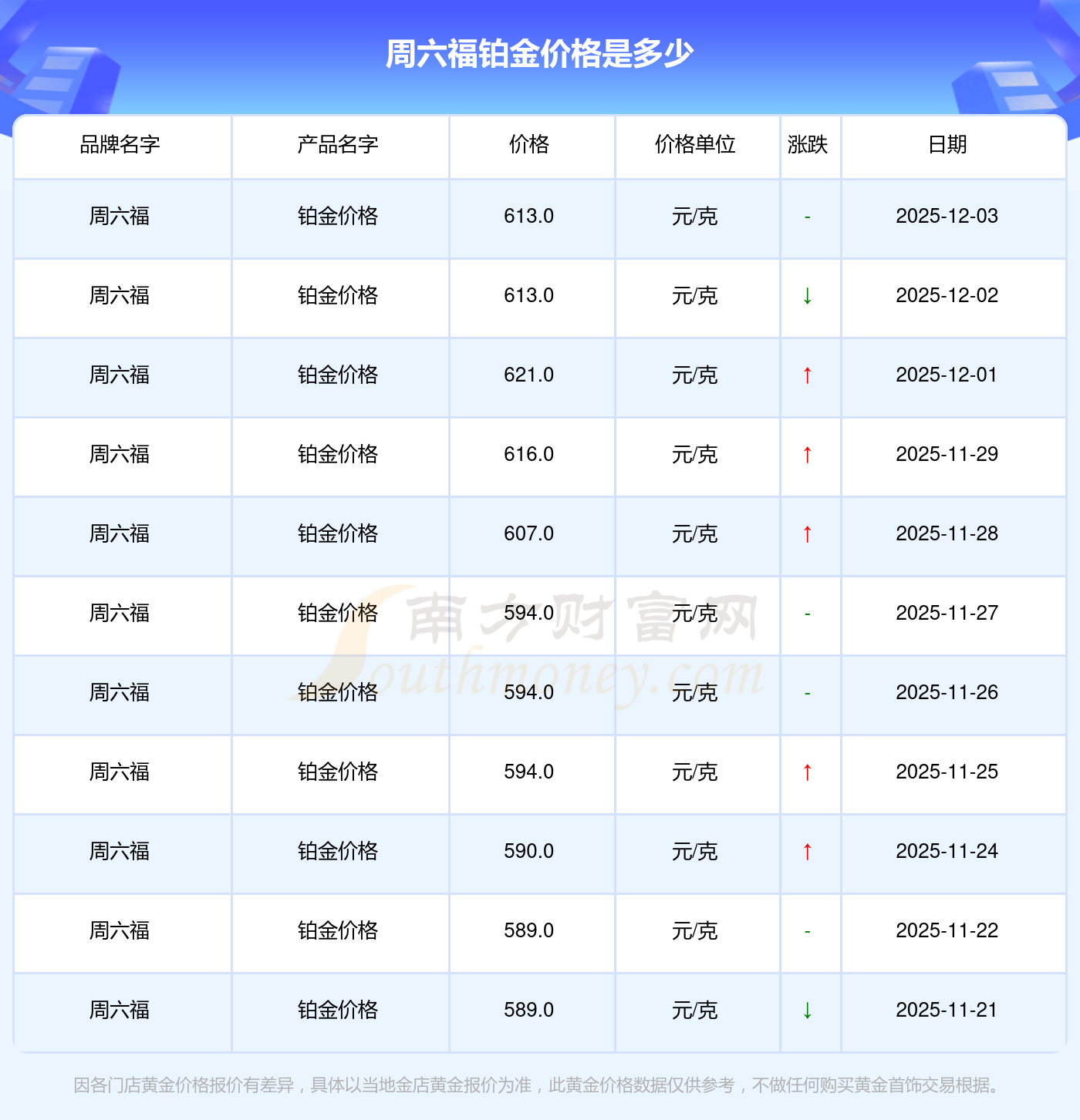 今日(2025年12月3日)周六福鉑金價格為613.0元/克。
