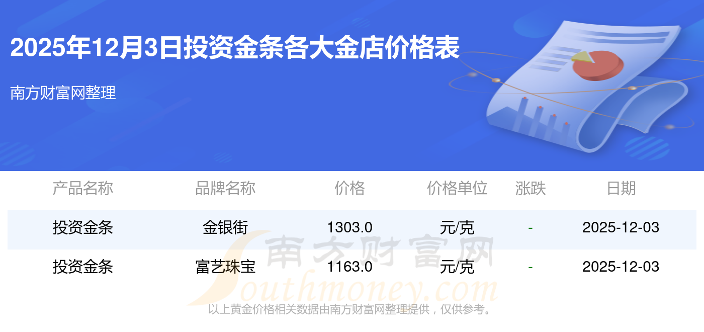 2025年12月3日周大福、周大福、周大福、周大福、周大福、周大福、周大福、老鳳祥、老鳳祥、老鳳祥、六福等各大金店品牌投資金條最新價格如下:周大福黃金價格1328.0元/克,周大福鉑金價格663.0元/克,周大福飾品金價(內(nèi)地)1328.0元/克,周大福黃金飾品(香港)46770.0,周大福鉑金價格(香港)18990.0,周大福金條價格(香港)42190.0,周大福金條金價(內(nèi)地)1165.0元/克,老鳳祥黃金價格1327.0元/克,老鳳祥鉑金價格600.0元/克,老鳳祥足金價格1327.0元/克,六福黃金價格1326.0元/克。