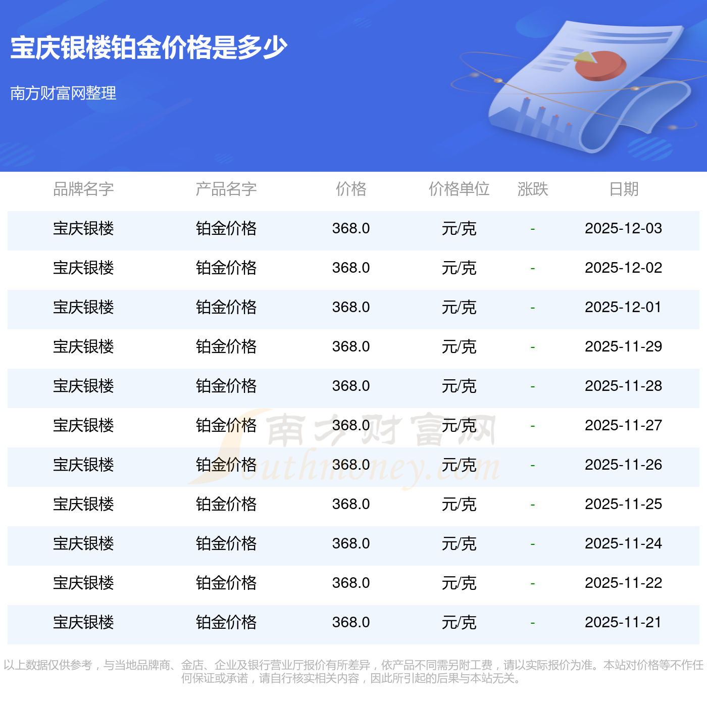 今日寶慶銀樓鉑金價格:368.0元/克。