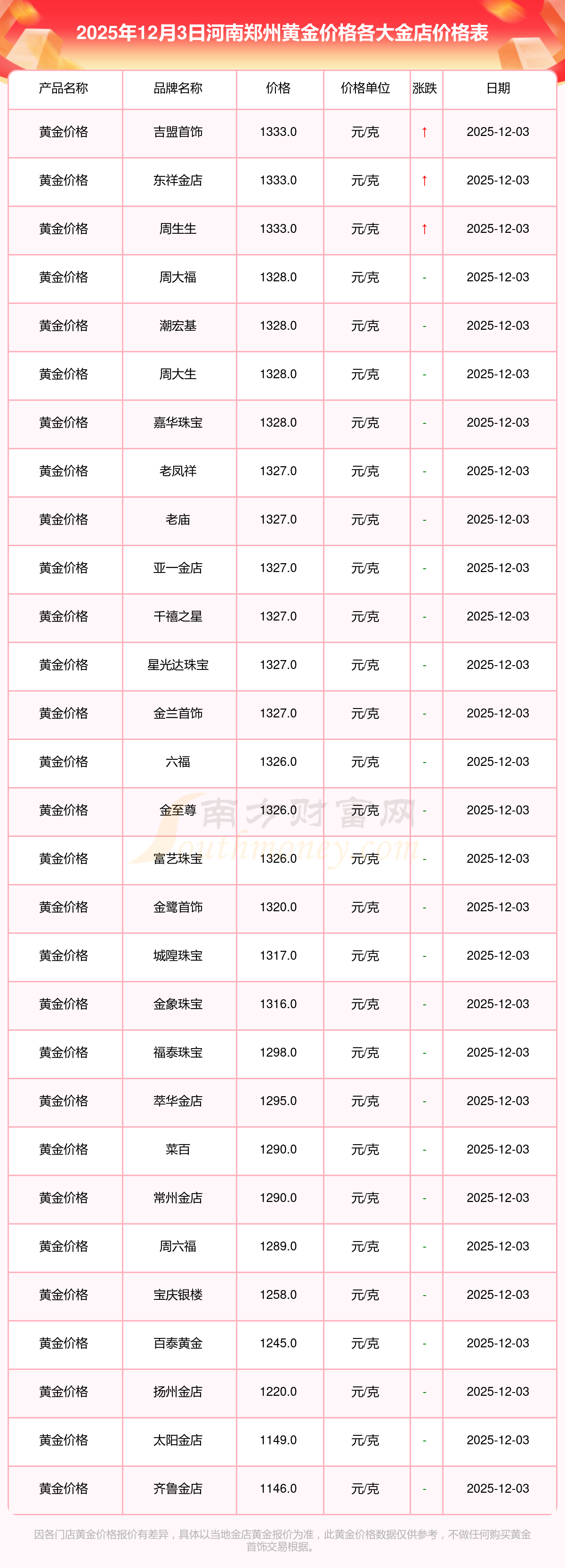 2025年12月3日河南鄭州周大福、周大福、周大福、周大福、周大福、周大福、周大福、老鳳祥、老鳳祥、老鳳祥、六福等各大金店品牌黃金價(jià)格最新價(jià)格行情來了,如下:周大福黃金價(jià)格1328.0元/克,周大福鉑金價(jià)格663.0元/克,周大福飾品金價(jià)(內(nèi)地)1328.0元/克,周大福黃金飾品(香港)46770.0,周大福鉑金價(jià)格(香港)18990.0,周大福金條價(jià)格(香港)42190.0,周大福金條金價(jià)(內(nèi)地)1165.0元/克,老鳳祥黃金價(jià)格1327.0元/克,老鳳祥鉑金價(jià)格600.0元/克,老鳳祥足金價(jià)格1327.0元/克,六福黃金價(jià)格1326.0元/克。
