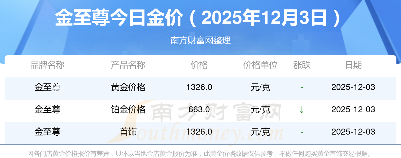 2025年12月3日各大金店黃金價(jià)格最新價(jià)格:周大福1328.0元/克,周大福663.0元/克,周大福1328.0元/克,周大福46770.0,周大福18990.0,周大福42190.0,周大福1165.0元/克,老鳳祥1327.0元/克,老鳳祥600.0元/克,老鳳祥1327.0元/克,六福1326.0元/克。