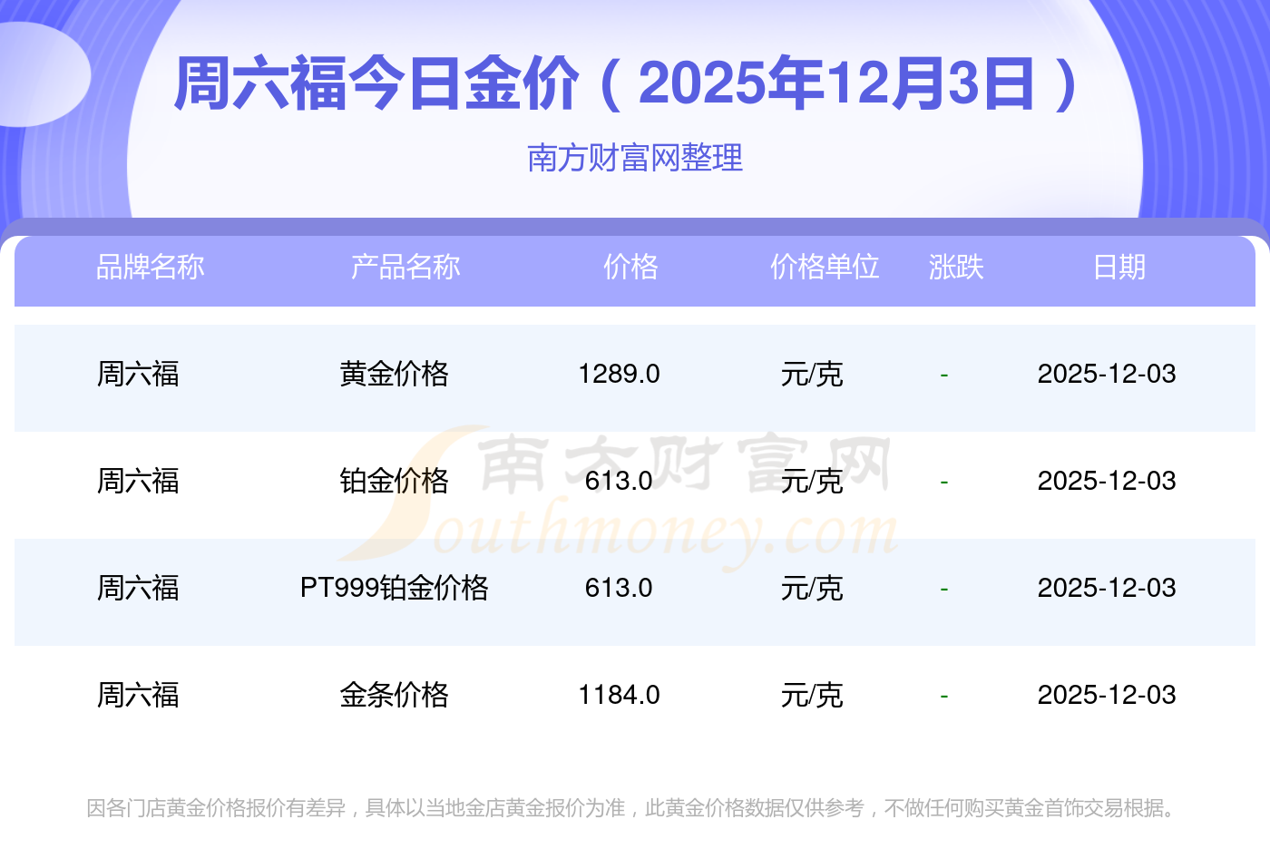 2025年12月3日周六福最新價格:黃金價格1328.0元/克,鉑金價格663.0元/克,飾品金價(內(nèi)地)1328.0元/克,黃金飾品(香港)46770.0,鉑金價格(香港)18990.0,金條價格(香港)42190.0,金條金價(內(nèi)地)1165.0元/克,黃金價格1327.0元/克,鉑金價格600.0元/克,足金價格1327.0元/克,黃金價格1326.0元/克。