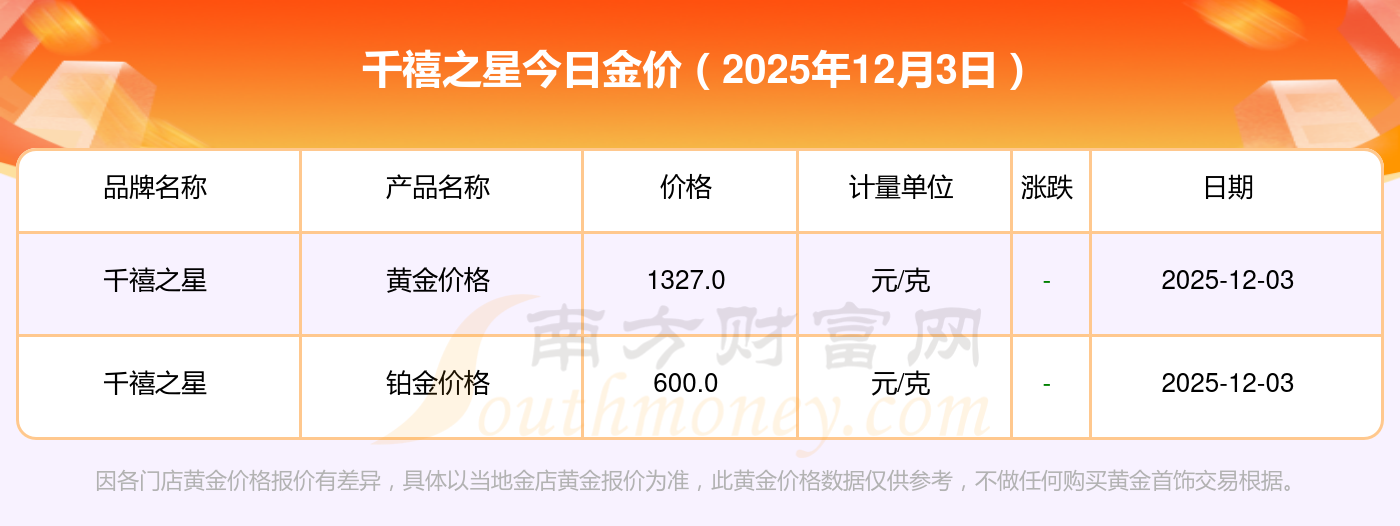 2025年12月3日千禧之星金價(jià)查詢:黃金價(jià)格1328.0元/克,鉑金價(jià)格663.0元/克,飾品金價(jià)(內(nèi)地)1328.0元/克,黃金飾品(香港)46770.0,鉑金價(jià)格(香港)18990.0,金條價(jià)格(香港)42190.0,金條金價(jià)(內(nèi)地)1165.0元/克,黃金價(jià)格1327.0元/克,鉑金價(jià)格600.0元/克,足金價(jià)格1327.0元/克,黃金價(jià)格1326.0元/克。