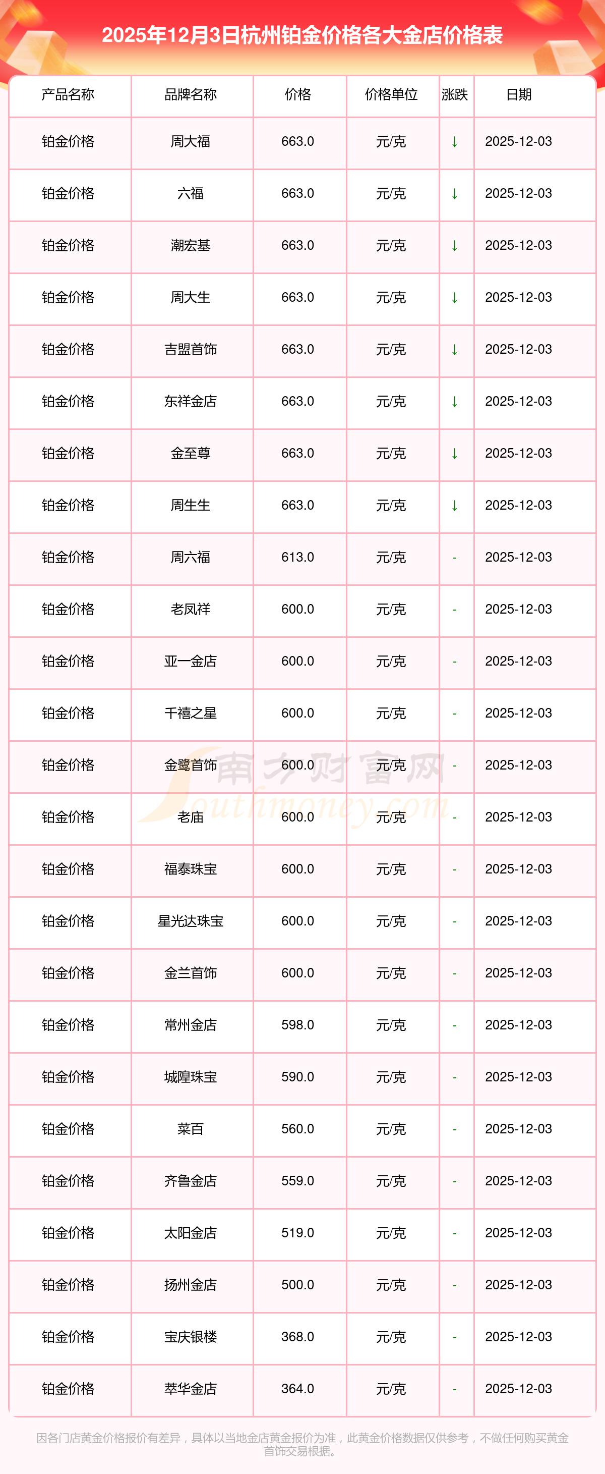 2025年12月3日杭州各大金店鉑金價(jià)格最新價(jià)格:周大福1328.0元/克,周大福663.0元/克,周大福1328.0元/克,周大福46770.0,周大福18990.0,周大福42190.0,周大福1165.0元/克,老鳳祥1327.0元/克,老鳳祥600.0元/克,老鳳祥1327.0元/克,六福1326.0元/克。