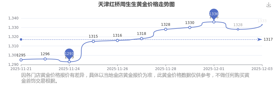 2025年12月3日,天津紅橋周生生黃金價格每克的價值量定格在1333.0元/克。