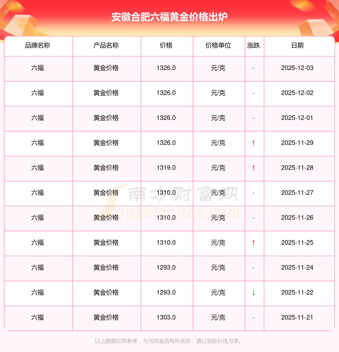 今日安徽合肥六福黃金價格公布今天,按克計價的黃金價格是多少安徽合肥六福的黃金價格在今日(2025年12月3日),每克售價為1326.0元/克。