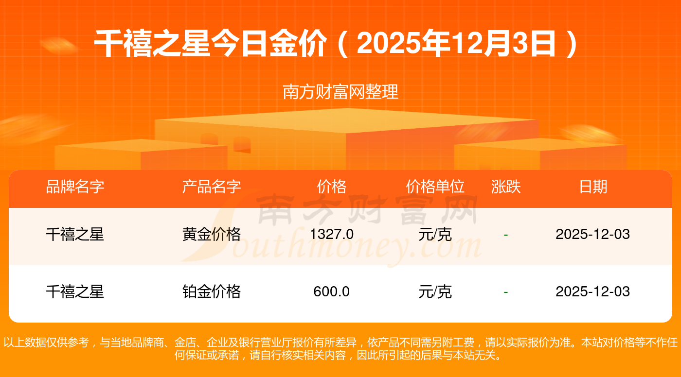 2025年12月3日周大福、周大福、周大福、周大福、周大福、周大福、周大福、老鳳祥、老鳳祥、老鳳祥、六福等各大金店品牌黃金價格最新價格如下:周大福黃金價格1328.0元/克,周大福鉑金價格663.0元/克,周大福飾品金價(內(nèi)地)1328.0元/克,周大福黃金飾品(香港)46770.0,周大福鉑金價格(香港)18990.0,周大福金條價格(香港)42190.0,周大福金條金價(內(nèi)地)1165.0元/克,老鳳祥黃金價格1327.0元/克,老鳳祥鉑金價格600.0元/克,老鳳祥足金價格1327.0元/克,六福黃金價格1326.0元/克。