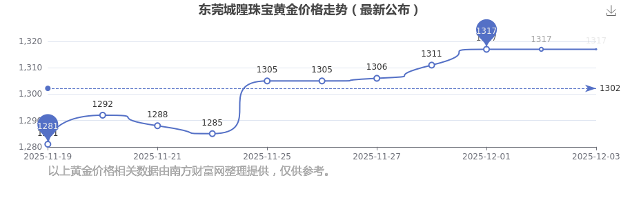 1317.0元/克,這是東莞城隍珠寶于 2025年12月3日所定的黃金價格。