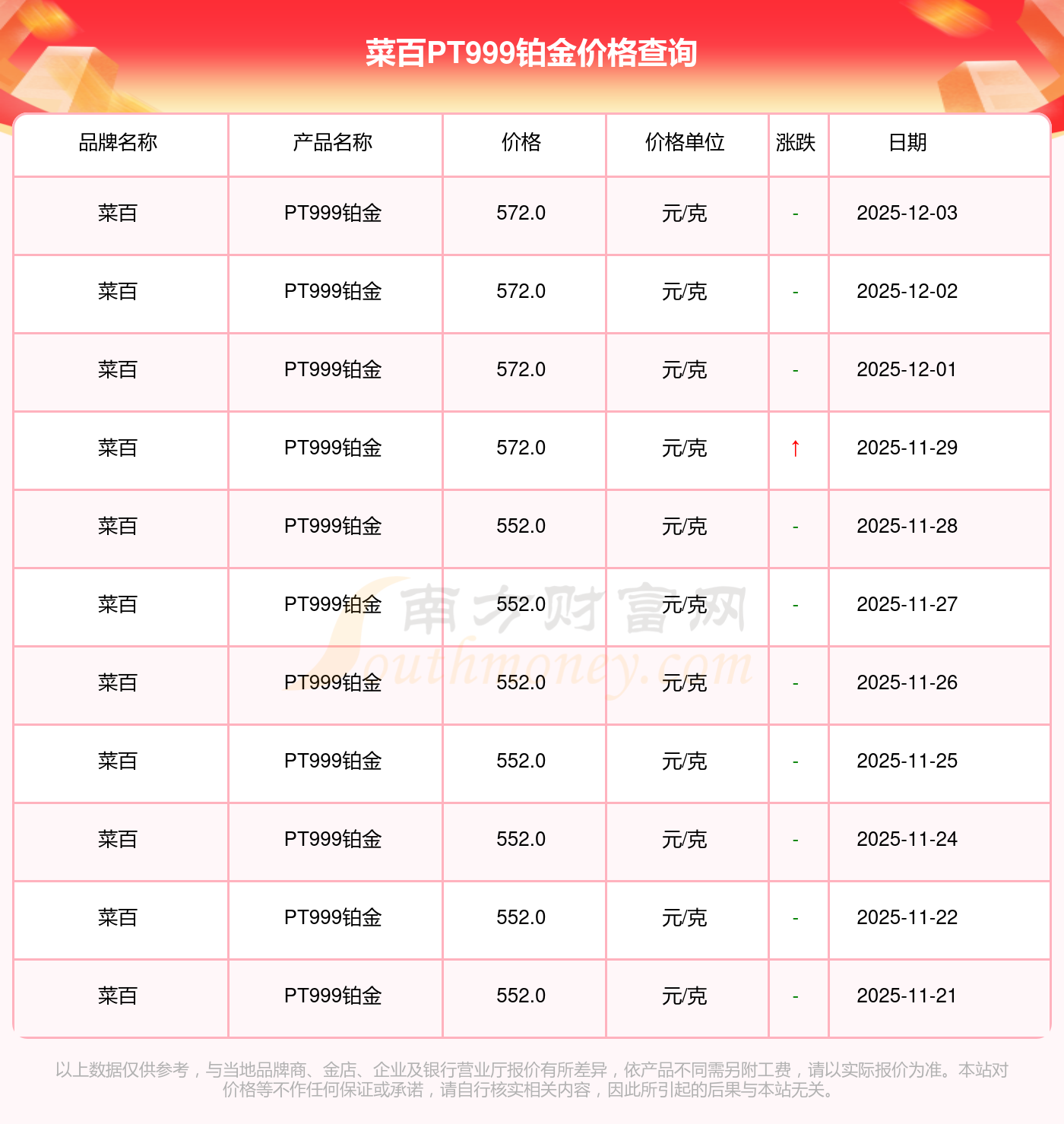 572.0元/克是菜百在今日給出的 PT999鉑金最新價格。