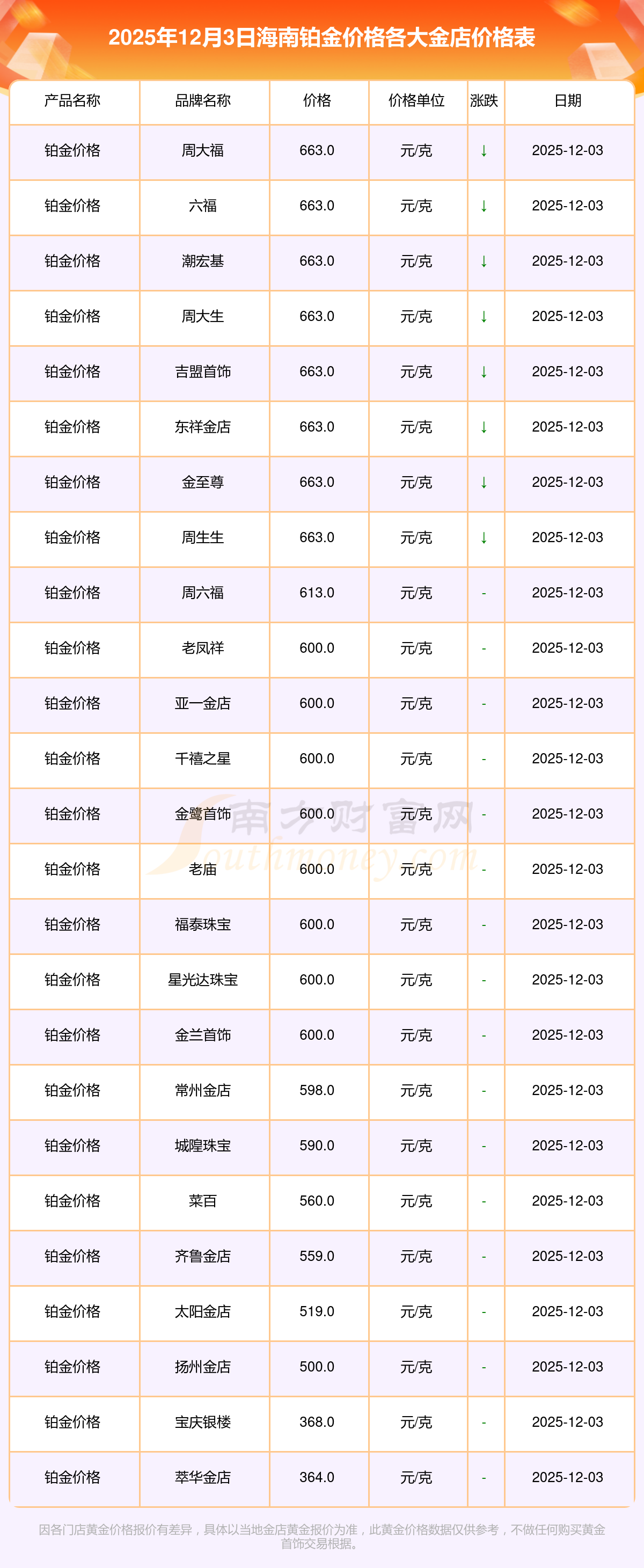 2025年12月3日海南周大福、周大福、周大福、周大福、周大福、周大福、周大福、老鳳祥、老鳳祥、老鳳祥、六福等各大金店品牌鉑金價格最新價格如下:周大福黃金價格1328.0元/克,周大福鉑金價格663.0元/克,周大福飾品金價(內(nèi)地)1328.0元/克,周大福黃金飾品(香港)46770.0,周大福鉑金價格(香港)18990.0,周大福金條價格(香港)42190.0,周大福金條金價(內(nèi)地)1165.0元/克,老鳳祥黃金價格1327.0元/克,老鳳祥鉑金價格600.0元/克,老鳳祥足金價格1327.0元/克,六福黃金價格1326.0元/克。