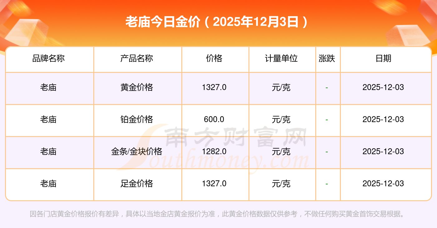 2025年12月3日老廟金價查詢:黃金價格1328.0元/克,鉑金價格663.0元/克,飾品金價(內(nèi)地)1328.0元/克,黃金飾品(香港)46770.0,鉑金價格(香港)18990.0,金條價格(香港)42190.0,金條金價(內(nèi)地)1165.0元/克,黃金價格1327.0元/克,鉑金價格600.0元/克,足金價格1327.0元/克,黃金價格1326.0元/克。